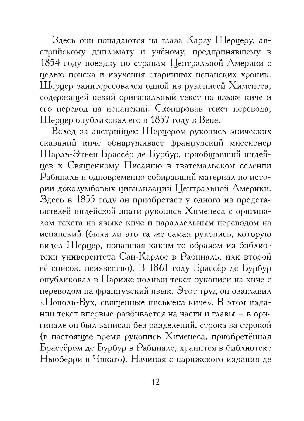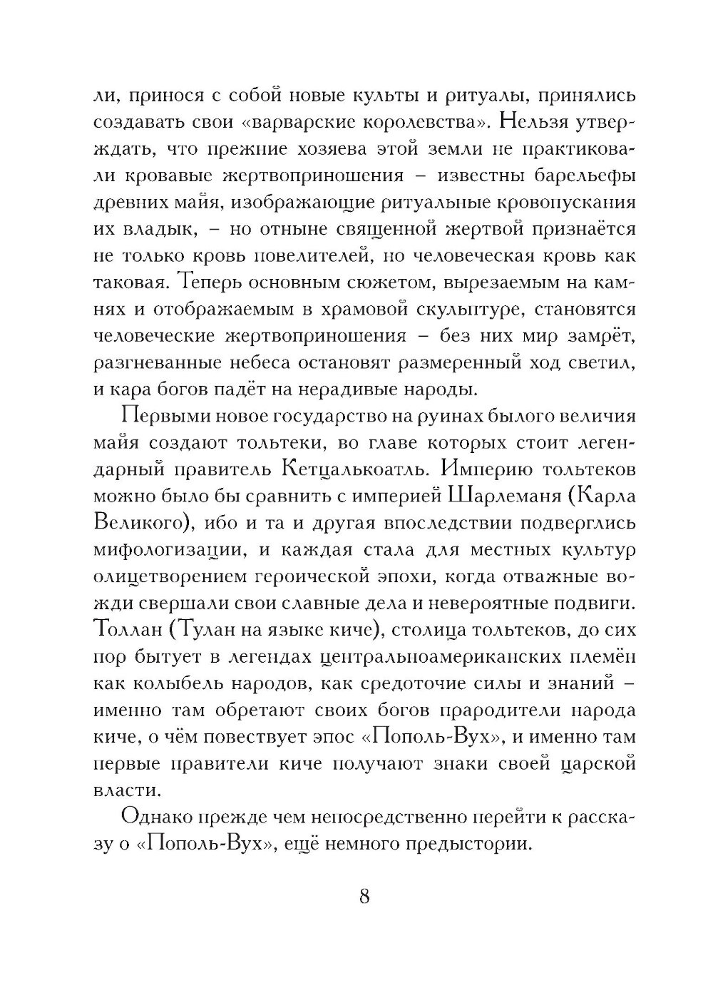 «Пополь-Вух» (в переводе «Книга народа») - один из немногих дошедших до нас литературных текстов, позволяющих заглянуть в удивительный мир мифических представлений индейцев Центральной Америки. В основе этого произведения лежат исторические события, легенды и эпические сказания киче - одного из племён народа майя, проживающего сегодня на территории Гватемалы. Хотя сами легенды, служащие основой этого литературного памятника, были сложены задолго до Конкисты, сохранившийся манускрипт записан в середине XVI века знатным индейцем-киче на родном языке при помощи латиницы. Предшествовавшие этой записи иероглифические кодексы майя вероятнее всего утрачены, о чём не раз сожалеет в «Пополь-Вух» ведущий свой рассказ повествователь. До настоящего времени на русском языке был представлен лишь научный перевод этого литературного памятника. Теперь читателю доступен художественный пересказ «Пополь-Вух», выполненный писателем Павлом Крусановым, чьему перу уже принадлежит прозаический пересказ «Калевалы», выдержавший более десяти изданий и заслуженно считающийся образцовым.| Издательство | Литературная матрица |