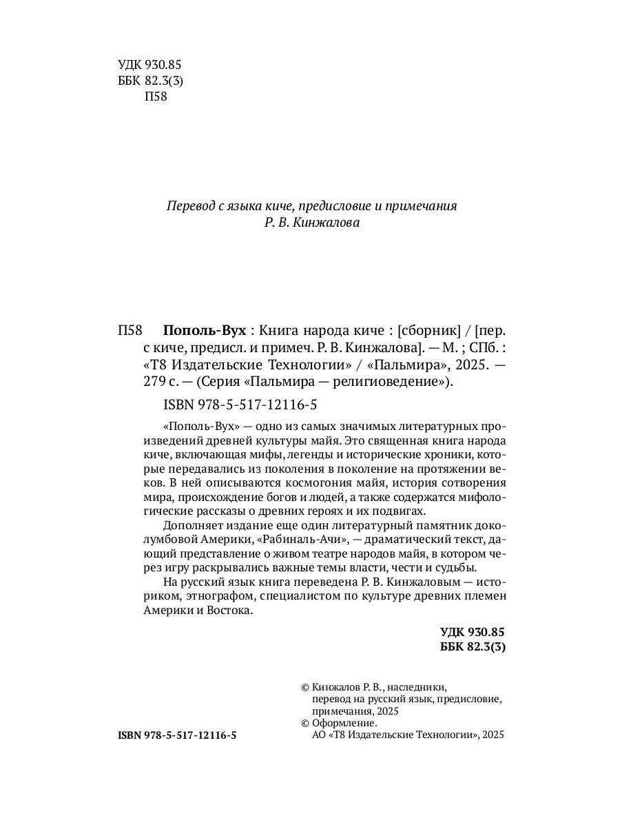 «Пополь-Вух» - одно из самых значимых литературных произведений древней культуры майя. Это священная книга народа киче, включающая мифы, легенды и исторические хроники, которые передавались из поколения в поколение на протяжении веков. В ней описываются космогония майя, история сотворения мира, происхождение богов и людей, а также содержатся мифологические рассказы о древних героях и их подвигах. Дополняет издание еще один литературный памятник доколумбовой Америки, «Рабиналь-Ачи», - драматический текст, дающий представление о живом театре народов майя, в котором через игру раскрывались важные темы власти, чести и судьбы. На русский язык книга переведена Р. В. Кинжаловым - историком, этнографом, специалистом по культуре древних племен Америки и Востока.| Издательство | Т8 RUGRAM |