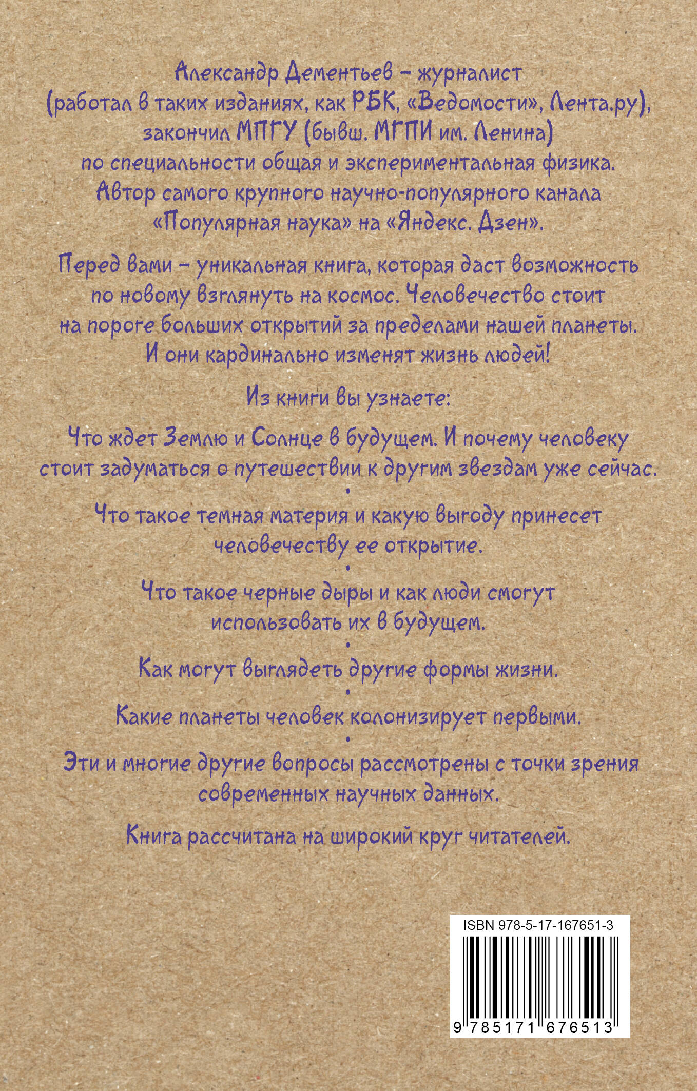Александр Дементьев - журналист (работал в таких изданиях, как РБК, "Ведомости", Лента.ру), закончил МПГУ (бывш. МГПИ им. Ленина) по специальности общая и экспериментальная физика. Автор самого крупного научно-популярного канала "Популярная наука" на "Яндекс. Дзен". Перед вами - уникальная книга, которая даст возможность по-новому взглянуть на космос. Человечество стоит на пороге больших открытий за пределами нашей планеты. И они кардинально изменят жизнь людей! Из книги вы узнаете: • Что ждет Землю и Солнце в будущем. И почему человеку стоит задуматься о путешествии к другим звездам уже сейчас. • Что такое темная материя и какую выгоду принесет человечеству ее открытие. • Что такое черные дыры и как люди смогут использовать их в будущем. • Как могут выглядеть другие формы жизни. • Какие планеты человек колонизирует первыми. Эти и многие другие вопросы рассмотрены с точки зрения современных научных данных. Книга рассчитана на широкий круг читателей.| Издательство | Издательство "АСТ" |
