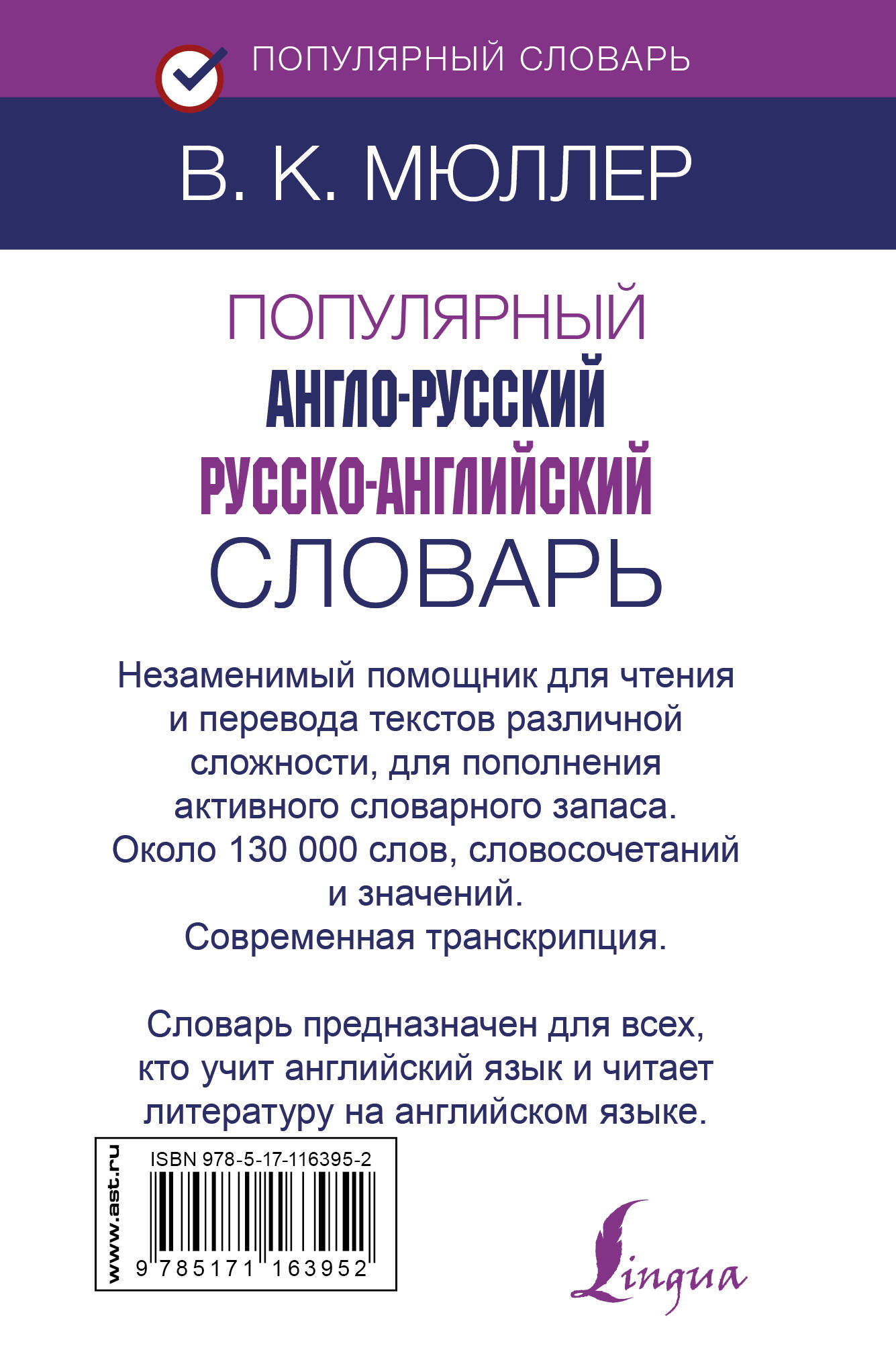 В новую серию "Популярный словарь" входят словари русского и английского языков. Автор "Популярного англо-русского русско-английского словаря" В. К. Мюллер известен очень хорошо. Его словарь пользуется неизменной популярностью уже не одно десятилетие. Издание обогащено современной лексикой, английские слова сопровождаются современной транскрипцией. Словарь окажет неоценимую помощь при изучении английского языка и при чтении литературы. Предназначен для всех, кто учит английский язык.| Издательство | Издательство "АСТ" |