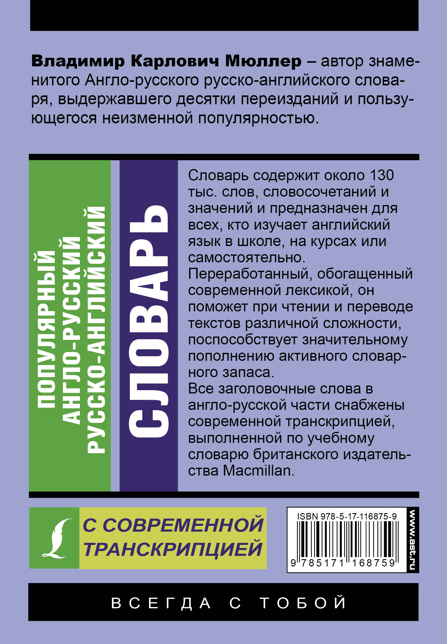 В серию "Эксклюзивный самоучитель" входят словари, самоучители и пособия по русскому и иностранным языкам, включая восточные. Серия известна на рынке и пользуется популярностью. "Популярный англо-русский русско-английский словарь с современной транскрипцией" - это знаменитый словарь Владимира Карловича Мюллера, переработанный и обогащенный современной лексикой. Заголовочные слова в англо-русской части снабжены современной транскрипцией, выполненной по учебному словарю британского издательства Macmillan. Словарь содержит около 130 тыс. слов, словосочетаний и значений и предназначен для всех, кто учит английский язык.| Издательство | ИЗДАТЕЛЬСТВО "АСТ" |