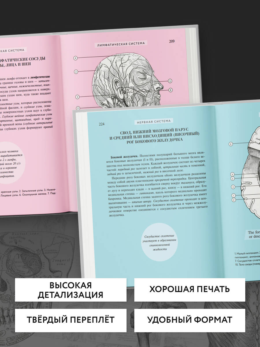 «Популярный атлас анатомии человека» - это оптимальный объем базовых знаний о строении человеческого тела. Созданная современными учеными-анатомами с использованием новейших данных, книга предлагает четко структурированную информацию, изложенную в 10 тематических главах по основным анатомическим системам. Особую ценность изданию придают высококачественные репродукции классических гравюр из знаменитой «Gray's Anatomy» - самого известного англоязычного учебника по анатомии человека. Более 200 классических иллюстраций выполнены с безупречной детализацией благодаря современным полиграфическим технологиям. Винтажные гравюры XIX века сочетаются с удобным компактным форматом и ярким дизайном, что делает книгу одновременно эстетически привлекательной и практичной в использовании. Этот атлас адресован всем, кто интересуется устройством человеческого организма и ценит качественные научно-популярные издания.| Издательство | ООО "Издательство "Эксмо" |