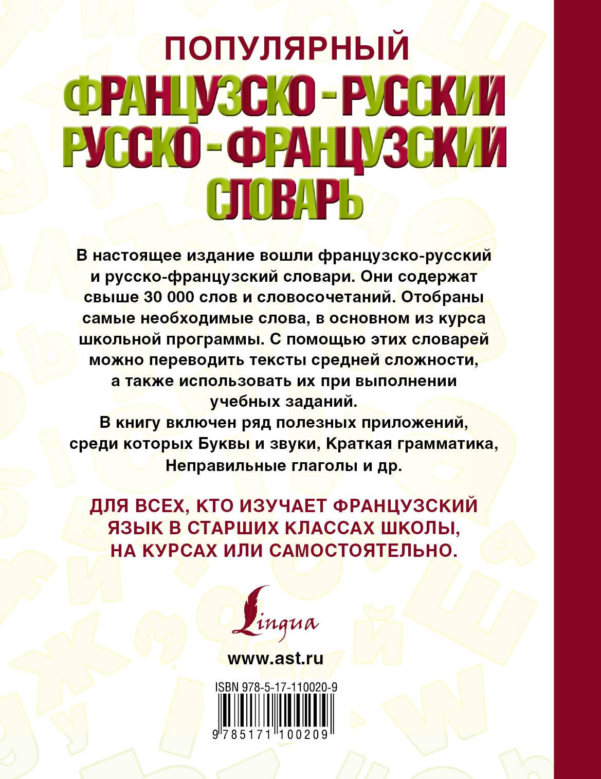 В настоящее издание вошли французско-русский и русско-французский словари. Они содержат свыше 30 000 слов и словосочетаний. Отобраны самые необходимые слова, в основном из курса школьной программы. С помощью этих словарей можно переводить тексты средней сложности, а также использовать их при выполнении учебных заданий. В книгу включен ряд полезных приложений, среди которых «Буквы и звуки», «Краткая грамматика», «Неправильные глаголы» и др. Для всех, кто изучает французский язык в старших классах школы, на курсах или самостоятельно.| Издательство | Издательство "АСТ" |