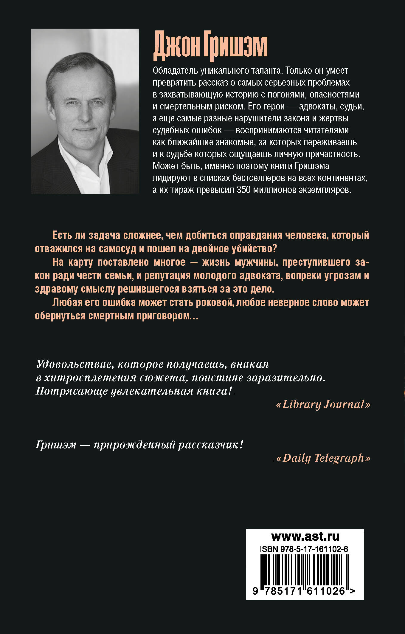 Есть ли задача сложнее, чем добиться оправдания человека, который отважился на самосуд и пошел на двойное убийство? На карту поставлено многое - жизнь мужчины, преступившего закон ради чести семьи, и репутация молодого адвоката, вопреки угрозам и здравому смыслу решившегося взяться за это дело. Любая его ошибка может стать роковой, любое неверное слово может обернуться смертным приговором…| Издательство | Издательство "АСТ" |