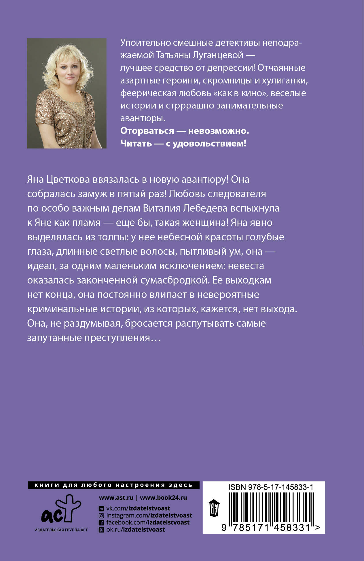 Яна Цветкова ввязалась в новую авантюру! Она собралась замуж в пятый раз! Любовь следователя по особо важным делам Виталия Лебедева вспыхнула к Яне как пламя - еще бы такая женщина! Яна явно выделялась из толпы: у нее небесной красоты голубые глаза, длинные светлые волосы, пытливый ум, она - идеал, за одним маленьким исключением: невеста оказалась законченной сумасбродкой. Ее выходкам нет конца, она постоянно влипает в невероятные криминальные истории, из которых, кажется, нет выхода. Она, не раздумывая, бросается распутывать самые запутанные преступления…| Издательство | АСТ |
