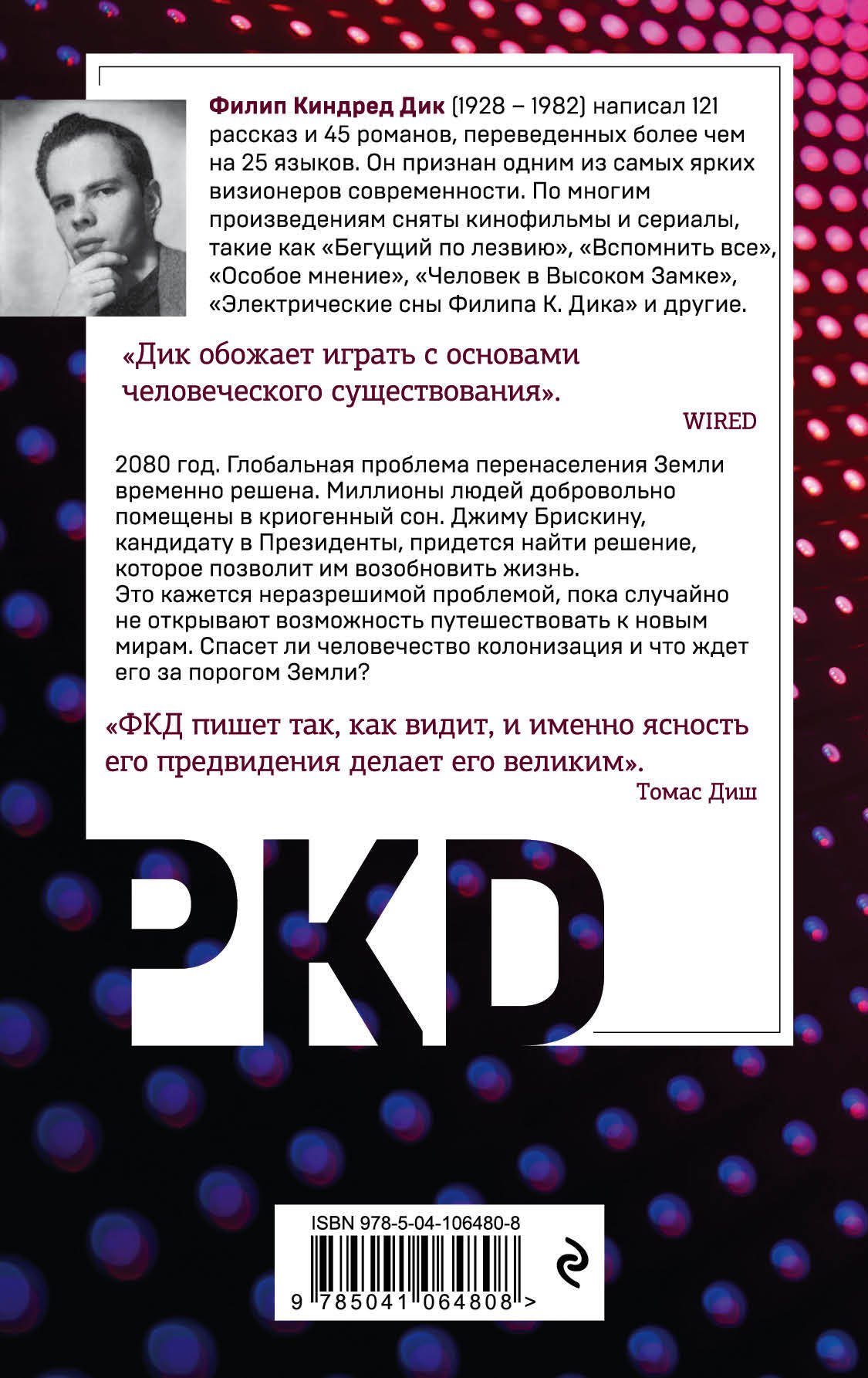 2080 год. Глобальная проблема перенаселения Земли временно решена. Миллионы людей добровольно помещены в криогенный сон. Джиму Брискину, кандидату в Президенты, придется найти решение, которое позволит им возобновить жизнь. Это кажется неразрешимой проблемой, пока случайно не открывают возможность путешествовать к новым мирам. Спасет ли человечество колонизация и что ждет его за порогом Земли? «Дик обожает играть с основами человеческого существования». - WIRED «ФКД пишет так, как видит, и именно ясность его предвидения делает его великим». - Томас Диш| Издательство | ООО "Издательство "Эксмо" |