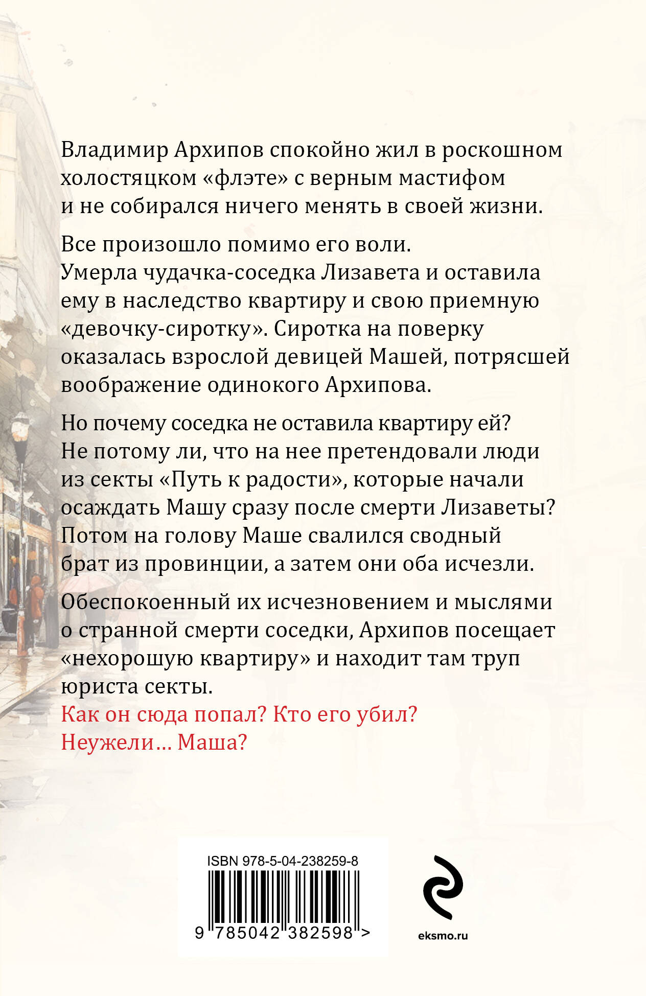 Владимир Архипов спокойно жил в роскошном холостяцком «флэте» с верным мастифом и не собирался ничего менять в своей жизни. Все произошло помимо его воли. Умерла чудачка-соседка Лизавета и оставила ему в наследство квартиру и свою приемную «девочку-сиротку». Сиротка на поверку оказалась взрослой девицей Машей, потрясшей воображение одинокого Архипова. Но почему соседка не оставила квартиру ей? Не потому ли, что на нее претендовали люди из секты «Путь к радости», которые начали осаждать Машу сразу после смерти Лизаветы? Потом на шею Маше свалился сводный брат из провинции, а затем они оба исчезли. Обеспокоенный их исчезновением и мыслями о странной смерти соседки Архипов посещает «нехорошую квартиру» и находит там труп юриста секты. Как он сюда попал? Кто его убил? Неужели… Маша? Татьяна Устинова - один из топовых авторов современной российской прозы, обладатель двух премий «Электронная буква», лауреат «ТЭФИ» в номинации «Сценарист телевизионного фильма». «Первая среди лучших» - так называют Татьяну Витальевну, и это не просто остроумный эпитет, а звание, подтвержденное десятками написанных романов, успешными экранизациями и, конечно, любовью многочисленных поклонников ее творчества.| Издательство | ООО "Издательство "Эксмо" |