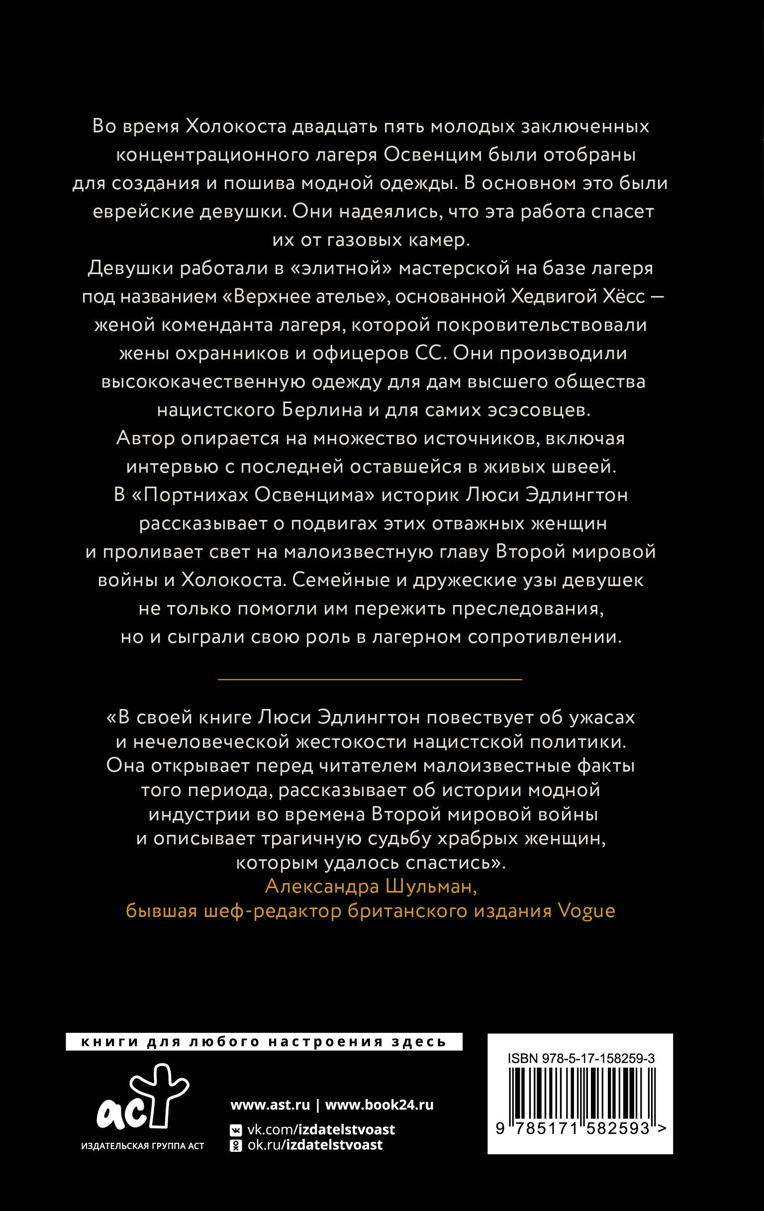 Во время Холокоста двадцать пять молодых заключенных концентрационного лагеря Освенцим были отобраны для создания и пошива модной одежды. В основном это были еврейские девушки. Они надеялись, что эта работа спасет их от газовых камер. Девушки работали в "элитной" мастерской на базе лагеря под названием "Верхнее ателье", основанной Хедвигой Хёсс - женой коменданта лагеря, которой покровительствовали жены охранников и офицеров СС. Они производили высококачественную одежду для дам высшего общества нацистского Берлина и для самих эсэсовцев. В "Портнихах Освенцима" историк Люси Эдлингтон рассказывает о подвигах этих отважных женщин и проливает свет на малоизвестную главу Второй мировой войны и Холокоста. Семейные и дружеские узы девушек не только помогли им пережить преследования, но и сыграли свою роль в лагерном сопротивлении. Автор опирается на множество источников, включая интервью с последней оставшейся в живых швеей.