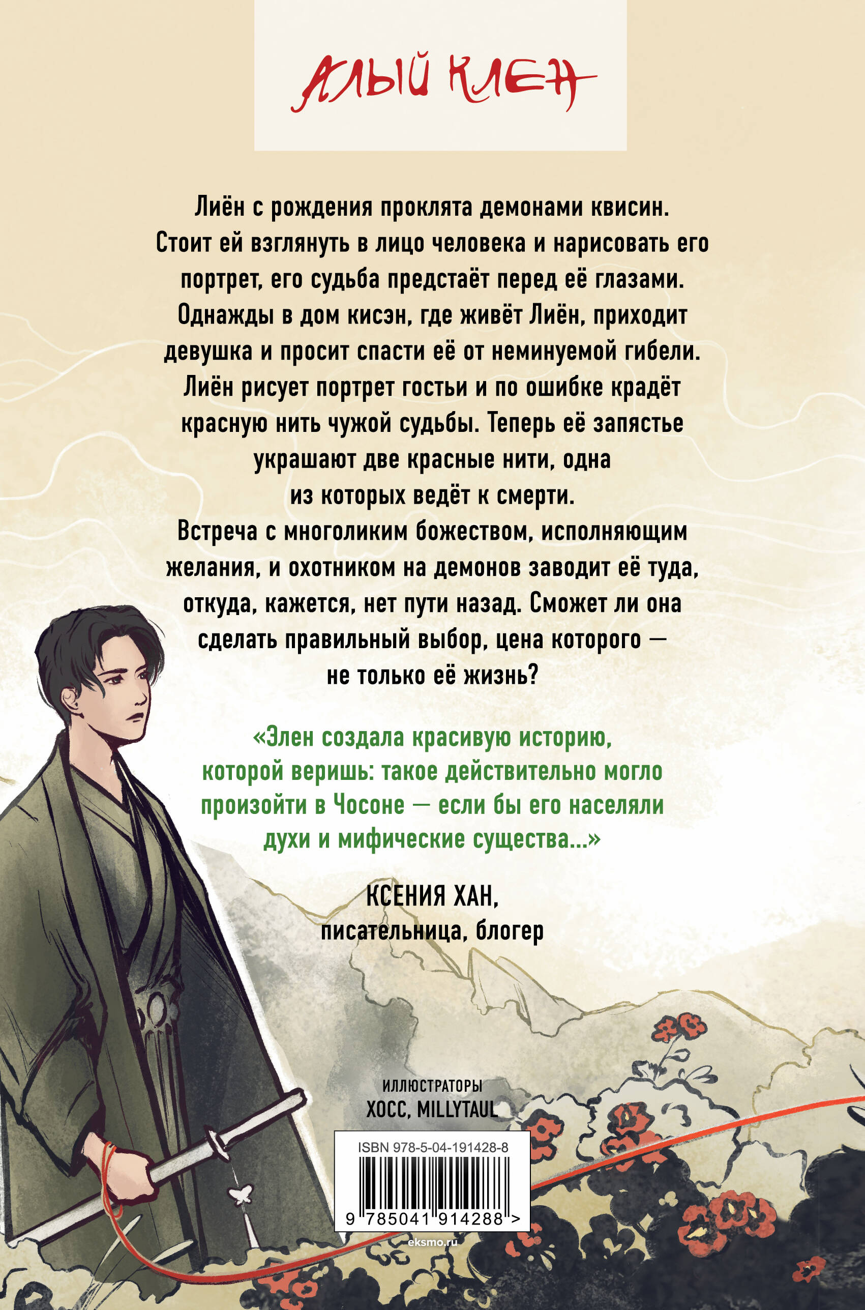 Лиён с рождения проклята демонами квисин. Стоит ей взглянуть в лицо человека и нарисовать его портрет, его судьба предстаёт перед её глазами. Однажды в дом кисэн, где живёт Лиён, приходит девушка и просит спасти её от неминуемой гибели. Лиён рисует портрет гостьи и по ошибке крадёт красную нить чужой судьбы. Теперь её запястье украшают две красные нити, одна из которых ведёт к смерти. Встреча с многоликим божеством, исполняющим желания, и охотником на демонов заводит её туда, откуда, кажется, нет пути назад. Сможет ли она сделать правильный выбор, цена которого - не только её жизнь? 1. Современный тренд: любимая многими корейская мифология, вплетенная в авторский мир, приправленная символизмом и скрытыми смыслами. 2. Чувственная история о преданности и любви, магии и хитросплетениях судьбы. 3. Необычные способности героини, язвительный герой и одна очаровательная лисица-кумихо. 4. Любовный треугольник со сложным выбором: бог или охотник на демонов? 5. Интрига до самого конца.| Издательство | ООО "Издательство "Эксмо" |