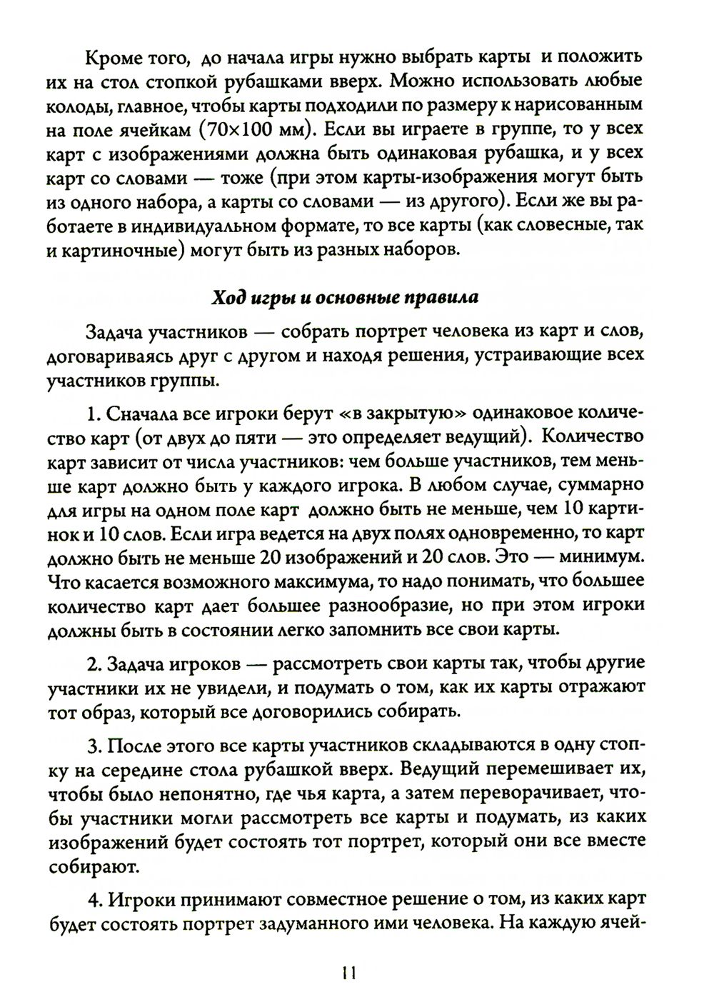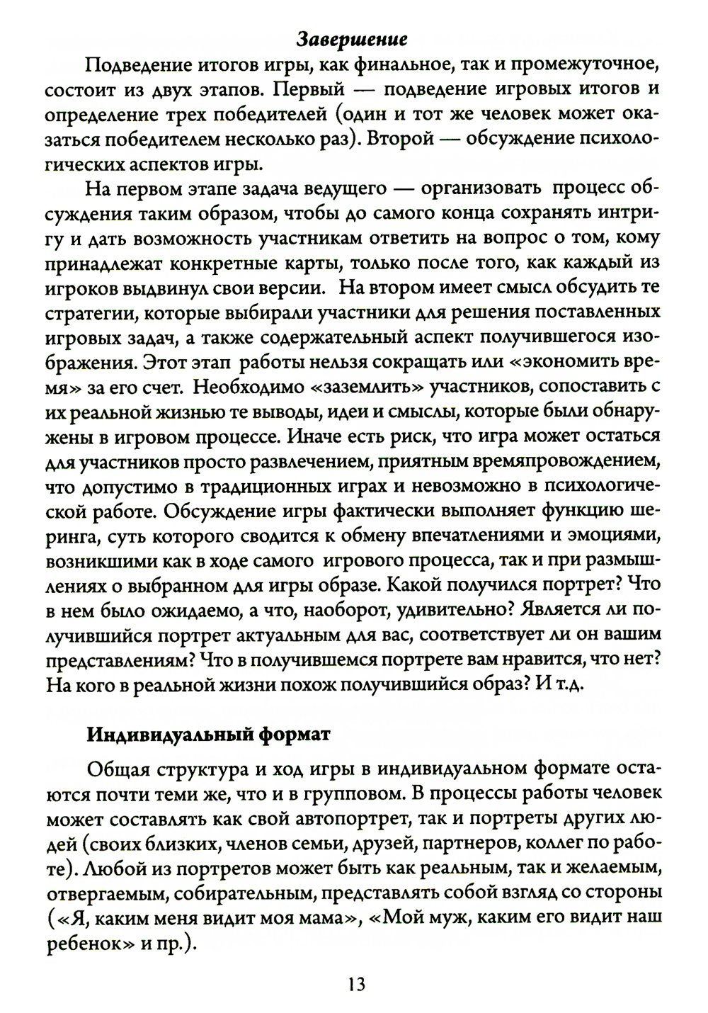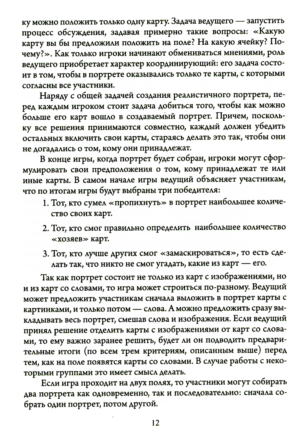 Суть игры состоит в создании «портрета» некоего человека (при этом человек может служить и образом организации, например) или людей при помощи метафорических карт и карточек со словами. Что такое портрет в любом его воплощении? Об этом можно много рассуждать, но, по сути, это во многом выражение внутреннего мира человека через его внешние проявления. Встреча с портретным изображением любого стиля или жанра - это встреча с представлением о конкретном человеке, о коллективе или о людях в целом, автопортрет - это встреча с представлением о себе и о своих отношениях с миром. Поскольку основной смысл нашей игры не в соревновании, а в размышлении о себе, о других людях и о человеческих ценностях, то важной частью игрового процесса является акцентирование той части личностной проблематики, которая и становится предметом размышления во время игрового процесса и его обсуждения. Для клиента это выглядит как формулирование запроса, приведшего его к психологу, ведь игра в нашем случае является лишь одной из форм психологической работы. Наиболее эффективно использование этой игровой платформы при следующих запросах: Самопознание, исследование своей личности: «Кто я? Каким я был, каков я сейчас и каким я могу быть?». Исследование окружения: «Кто эти люди, которые окружают меня? С каким человеком рядом мне хорошо, а с каким плохо? В чем и в ком я нуждаюсь?». Сложности коммуникации: «Мы не можем договориться между собой. Сложно аргументировать, трудно прийти к единому решению». Состав комплекта: два игровых поля, руководство.| Издательство | Генезис |