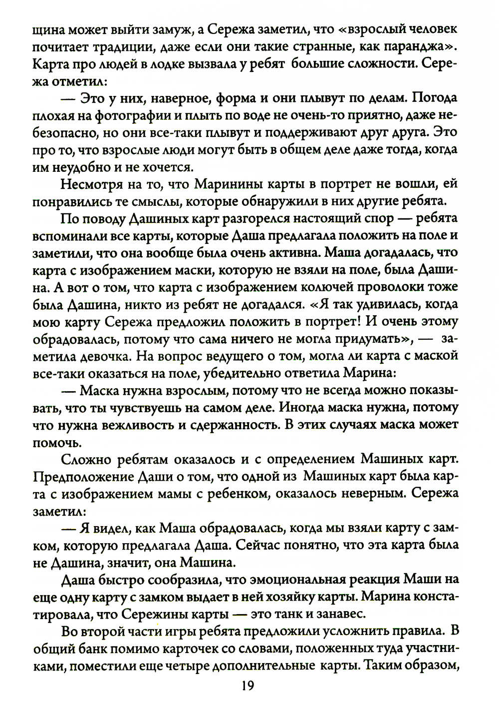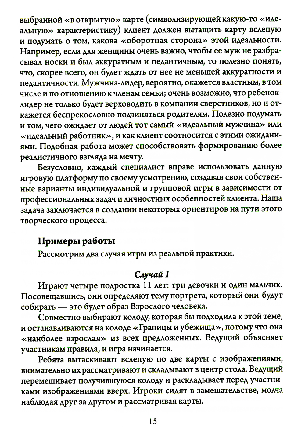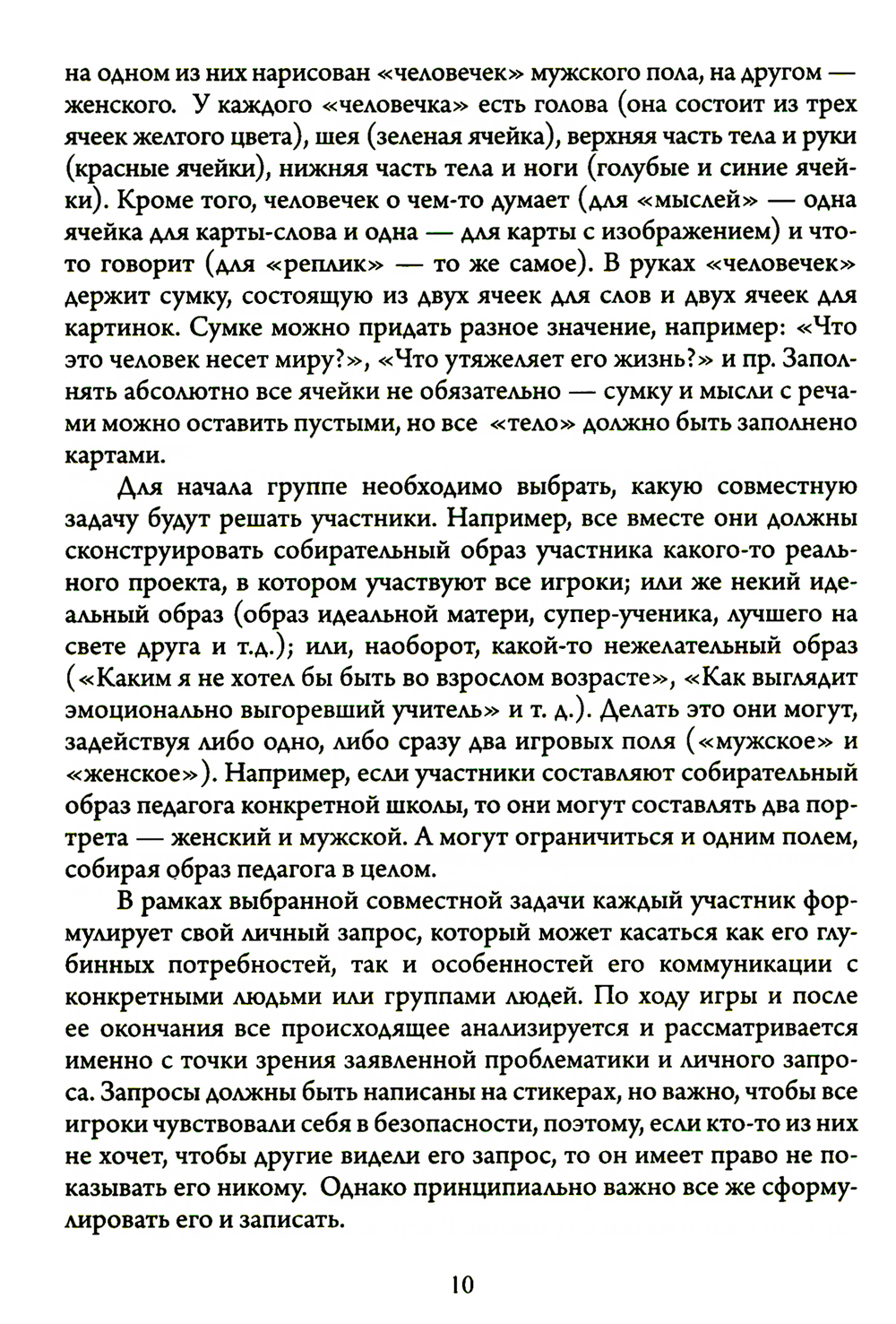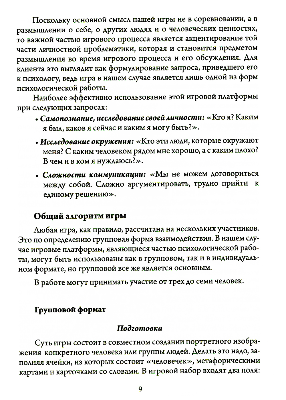 Суть игры состоит в создании «портрета» некоего человека (при этом человек может служить и образом организации, например) или людей при помощи метафорических карт и карточек со словами. Что такое портрет в любом его воплощении? Об этом можно много рассуждать, но, по сути, это во многом выражение внутреннего мира человека через его внешние проявления. Встреча с портретным изображением любого стиля или жанра - это встреча с представлением о конкретном человеке, о коллективе или о людях в целом, автопортрет - это встреча с представлением о себе и о своих отношениях с миром. Поскольку основной смысл нашей игры не в соревновании, а в размышлении о себе, о других людях и о человеческих ценностях, то важной частью игрового процесса является акцентирование той части личностной проблематики, которая и становится предметом размышления во время игрового процесса и его обсуждения. Для клиента это выглядит как формулирование запроса, приведшего его к психологу, ведь игра в нашем случае является лишь одной из форм психологической работы. Наиболее эффективно использование этой игровой платформы при следующих запросах: Самопознание, исследование своей личности: «Кто я? Каким я был, каков я сейчас и каким я могу быть?». Исследование окружения: «Кто эти люди, которые окружают меня? С каким человеком рядом мне хорошо, а с каким плохо? В чем и в ком я нуждаюсь?». Сложности коммуникации: «Мы не можем договориться между собой. Сложно аргументировать, трудно прийти к единому решению». Состав комплекта: два игровых поля, руководство.| Издательство | Генезис |