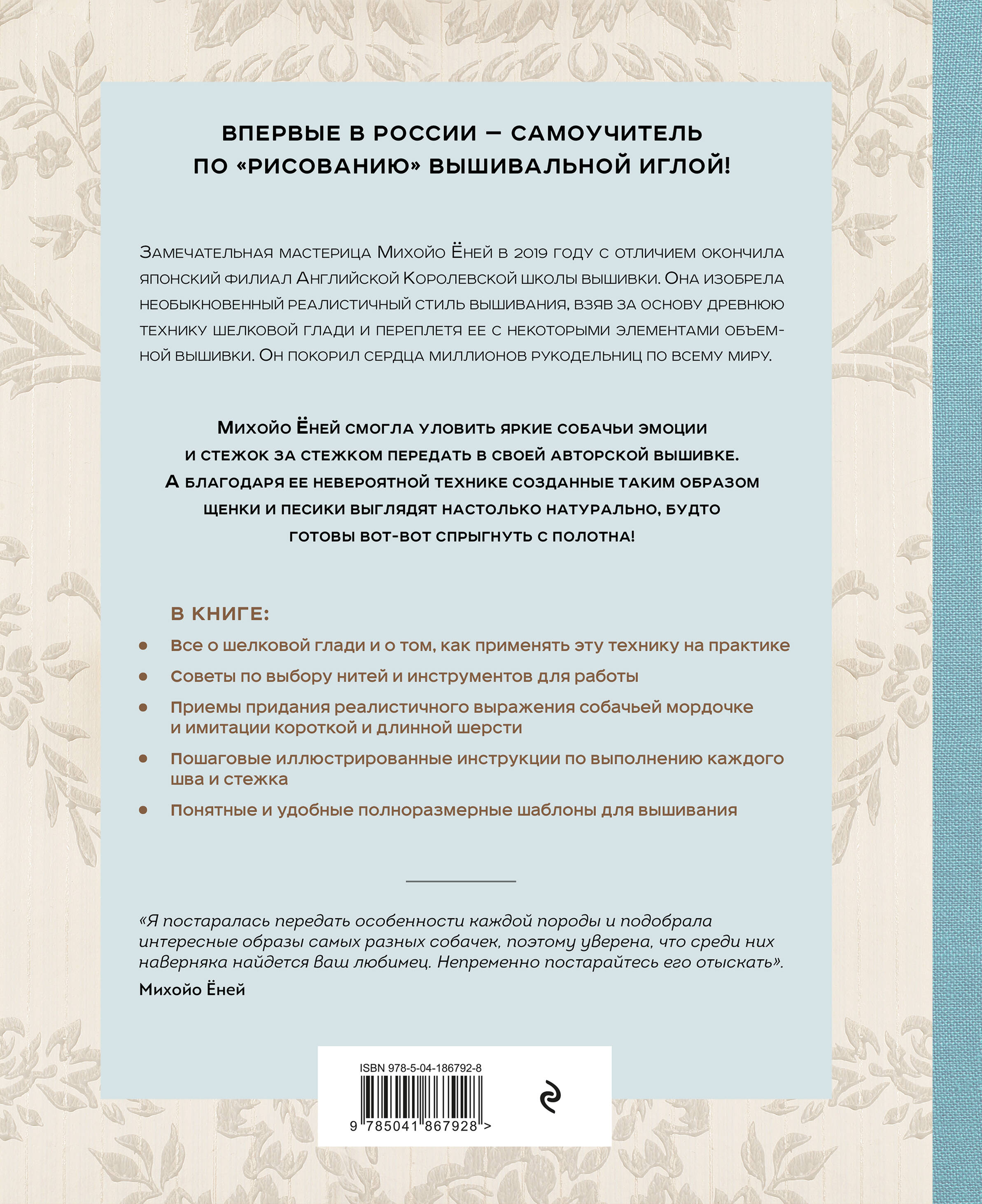 Умеете ли вы рисовать карандашами, красками или фломастерами? Вероятно, да. А умеете ли вы «рисовать» иглой? Если нет, вас этому с легкостью научит выпускница Английской Королевской школы вышивки Михойо Ёней! Собаки издревле были в почете в Стране Восходящего Солнца. Их по праву называют лучшими друзьями человека. Хоть и не напрямую, но собаки все же способны передавать свои мысли, чувства и потребности с помощью мимики и поведения, общаясь со своим хозяином. Четвероногим любимцам посвящали литературные произведения, ставили памятники и изображали на картинах, в том числе вышитых! Знаменитая японская мастерица Михойо Ёней взяла за основу своих работ древнюю технику вышивания шелковой гладью и решила переплести ее с элементами объемной вышивки. Щеночки и песики, рождающиеся на полотне Михойо, получаются настолько реалистичными, будто вот-вот прыгнут к вам в объятия. 32 реалистичных дизайна вышивок, посвященные всем любителям собак. • Всё о шелковой глади и том, как применять эту технику на практике. • Советы по выбору нитей и инструментов для работы. • Приемы придания реалистичного выражения собачьей мордочке и имитации короткой и длинной шерсти. • Пошаговые иллюстрированные инструкции по выполнению каждого шва и стежка. • Понятные и удобные полноразмерные шаблоны для вышивания.| Издательство | ООО "Издательство "Эксмо" |