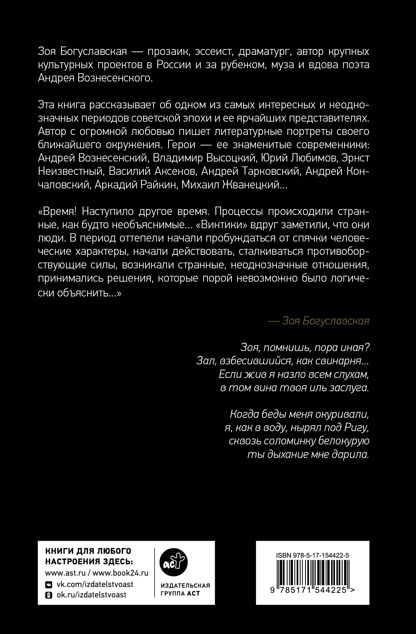 Эта книга об одном из самых интересных и неоднозначных периодов советской эпохи и ее ярчайших представителях. Автор с огромной любовью пишет литературные портреты своего ближайшего окружения. Это прежде всего ее знаменитые современники: Андрей Вознесенский, Владимир Высоцкий, Юрий Любимов, Эрнст Неизвестный, Василий Аксенов, Андрей Тарковский, Андрей Кончаловский, Аркадий Райкин, Михаил Жванецкий и многие другие… А еще Зоя Богуславская делится с читателями своими незабываемыми впечатлениями от встреч с мировыми знаменитостями: Брижит Бордо, Михаилом Барышниковым, Вольфом Мессингом, Вангой, Нэнси Рейган, Марком Шагалом, Франсин дю Плесси Грей и многими другими.| Издательство | ИЗДАТЕЛЬСТВО "АСТ" |
