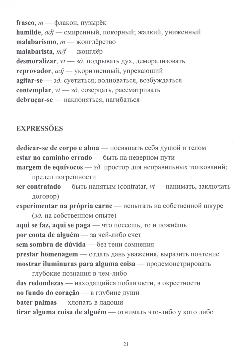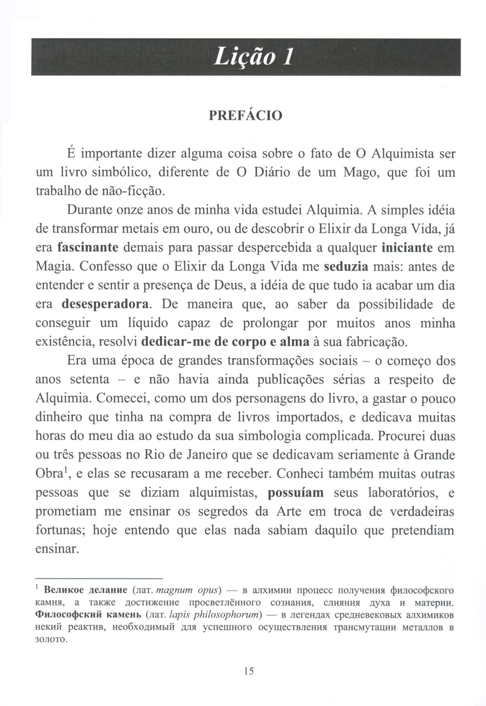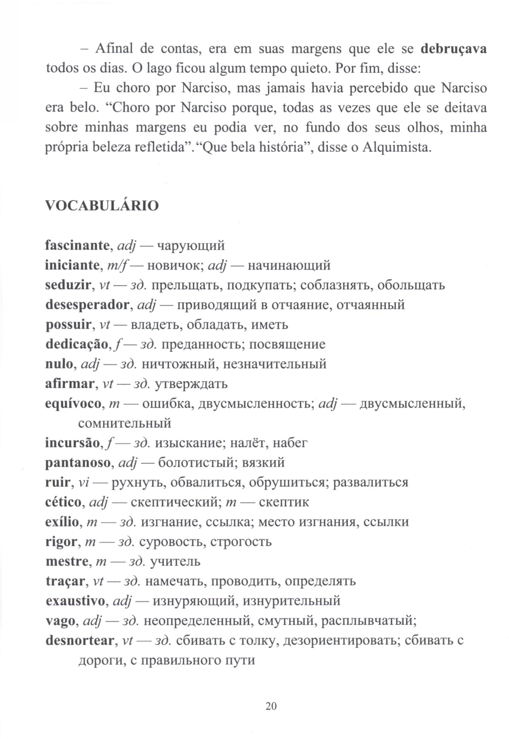 Учебное пособие разработано на основе оригинального текста романа Паоло Коэльо «Алхимик» и предназначено для развития иноязычной коммуникативной компетенции учащихся, а также навыков чтения художественной литературы на португальском языке, изложения на португальском языке художественного текста, спонтанной речи на португальском языке. Задания пособия направлены на освоение студентами португальской лексики и фразеологии и знакомство студентов с особенностями бразильского варианта португальского языка. Отличительной особенностью пособия является построчная нумерация изучаемого текста, что облегчает поиск необходимой для выполнения заданий информации. Для студентов младших курсов бакалавриата МГИМО МИД России, изучающих португальский язык и владеющих им на уровне В1.