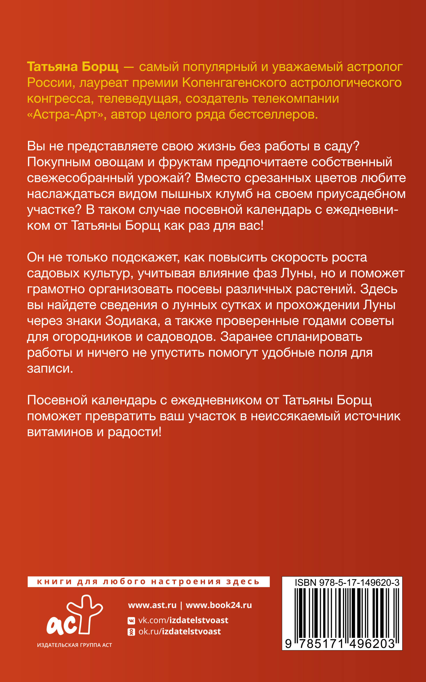 Татьяна Борщ - самый популярный и уважаемый астролог России, лауреат премии Копенгагенского астрологического конгресса, телеведущая, создатель телекомпании "Астра-Арт", автор целого ряда бестселлеров. Вы не представляете свою жизнь без работы в саду? Покупным овощам и фруктам предпочитаете собственный свежесобранный урожай? Вместо срезанных цветов любите наслаждаться видом пышных клумб на своем приусадебном участке? В таком случае посевной календарь с ежедневником от Татьяны Борщ как раз для вас! Он не только подскажет, как повысить скорость роста садовых культур, учитывая влияние фаз Луны, но и поможет грамотно организовать посевы различных растений. Здесь вы найдете сведения о лунных сутках и прохождении Луны через знаки Зодиака, а также проверенные годами советы для огородников и садоводов. Заранее спланировать работы и ничего не упустить помогут удобные поля для записи. Посевной календарь с ежедневником от Татьяны Борщ поможет превратить ваш участок в неиссякаемый источник витаминов и радости!| Издательство | АСТ |