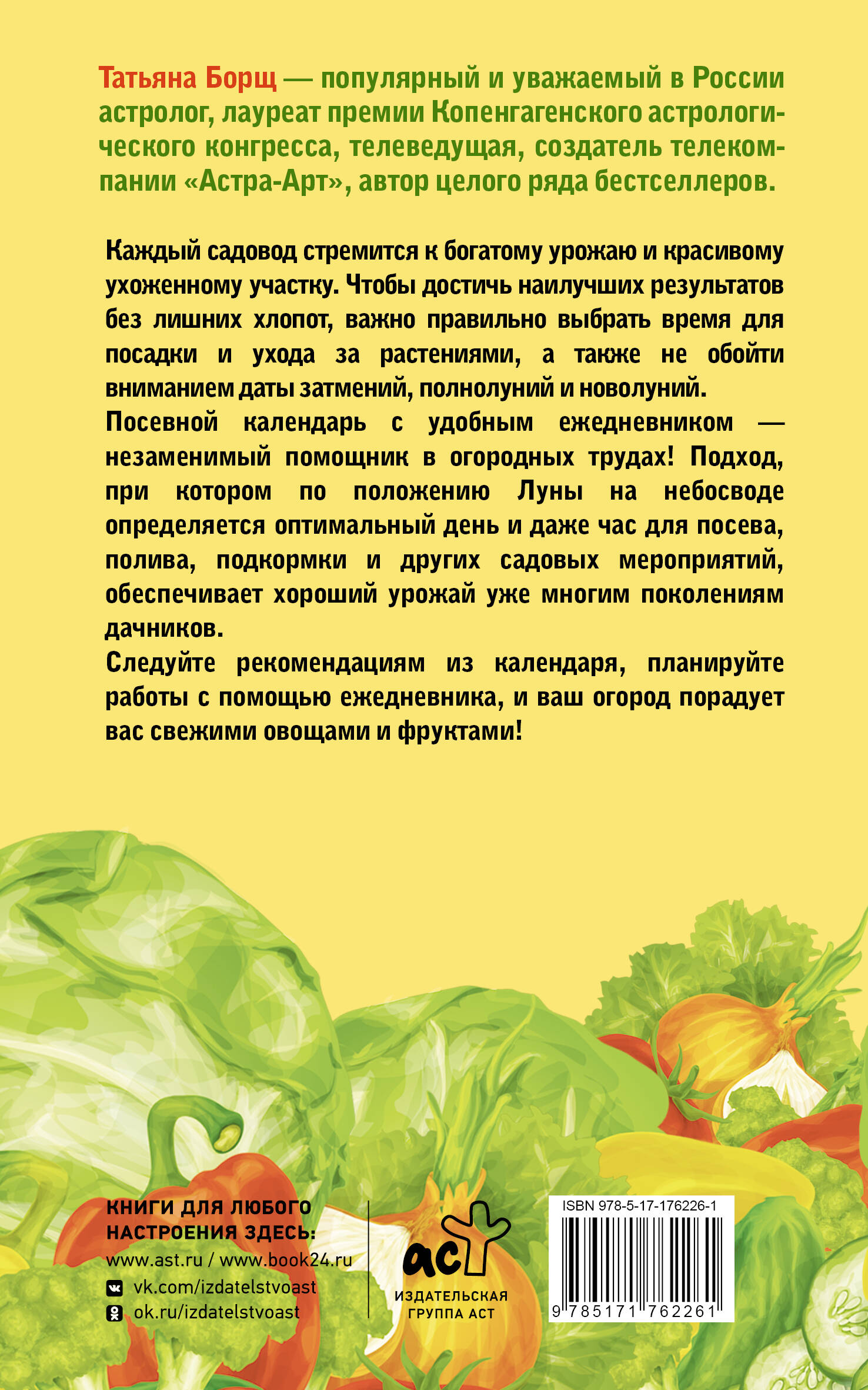 Татьяна Борщ - популярный и уважаемый в России астролог, лауреат премии Копенгагенского астрологического конгресса, телеведущая, создатель телекомпании "Астра-Арт", автор целого ряда бестселлеров. Каждый садовод стремится к богатому урожаю и красивому ухоженному участку. Чтобы достичь наилучших результатов без лишних хлопот, важно правильно выбрать время для посадки и ухода за растениями, а также не обойти вниманием даты затмений, полнолуний и новолуний. Посевной календарь с удобным ежедневником - незаменимый помощник в огородных трудах! Подход, при котором по положению Луны на небосводе определяется оптимальный день и даже час для посева, полива, подкормки и других садовых мероприятий, обеспечивает хороший урожай уже многим поколениям дачников. Следуйте рекомендациям из календаря, планируйте работы с помощью ежедневника, и ваш огород порадует вас свежими овощами и фруктами!| Издательство | Издательство "АСТ" |