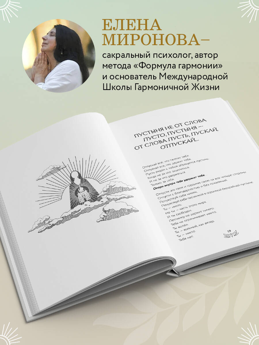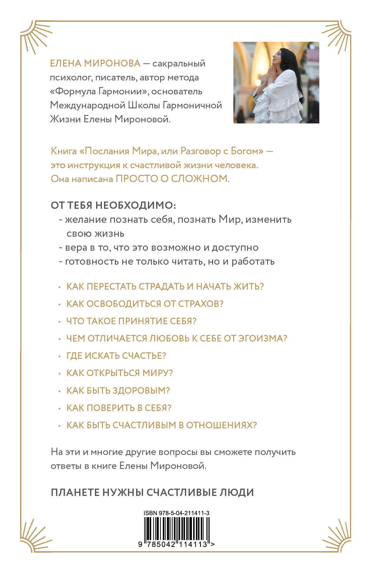 Книга Елены Мироновой, сакрального психолога, автора метода «Формула гармонии» и основателя Международной Школы Гармоничной Жизни, это искренний разговор Человека с Небом и со своей Душой. Елена дает уникальные духовные практики, раскрывая главную идею своего метода: обратившись к пути Гармонии, жить можно по-другому. «Послания Мира, или Разговор с Богом», вслед за знаменитой книгой Нила Доналда Уолша «Разговор с Богом», открывает новую реальность. Путь, на котором ты осознаешь, что жизнь - это путешествие, полное возможностей и смысла. И это путь освобождения от старых схем и стереотипов. Ты можешь жить по-другому - осознанно, свободно, в потоке, получая ответы, которые изменят тебя и твою жизнь. Открой перед собой океан возможностей - новые знания, инсайты и послания, которые ты можешь не только принять, но и передать другим. Готов ли ты сделать первый шаг? Послания Мира ждут тебя.
