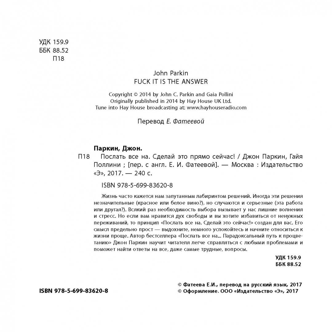 Жизнь часто кажется нам запутанным лабиринтом решений. Иногда эти решения незначительные (красное или белое вино?), но случаются и серьезные (эта работа или другая?) Всякий раз необходимость выбора вызывает у нас лишние волнения и стресс. Но если вам нравится дух свободы, и вы хотите избавиться от ненужных переживаний, то принцип «Послать все на. Сделай это сейчас!» создан для вас. Его смысл предельно прост - выдохните, немного успокойтесь и начните относиться к жизни проще. Автор бестселлера «Послать все на... Парадоксальный путь к процветанию», Джон Паркин научит читателя легче справлять с любыми проблемами и поможет найти ответы на все, даже самые трудные вопросы.