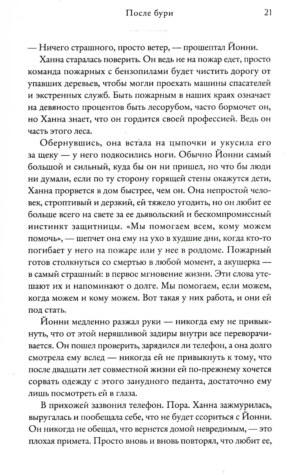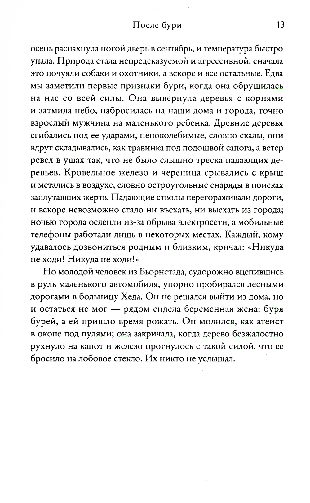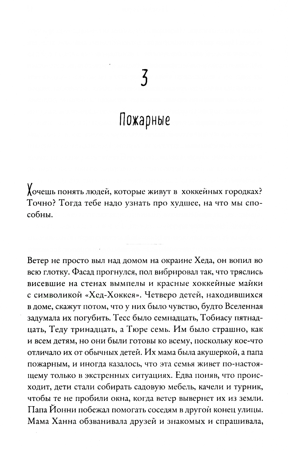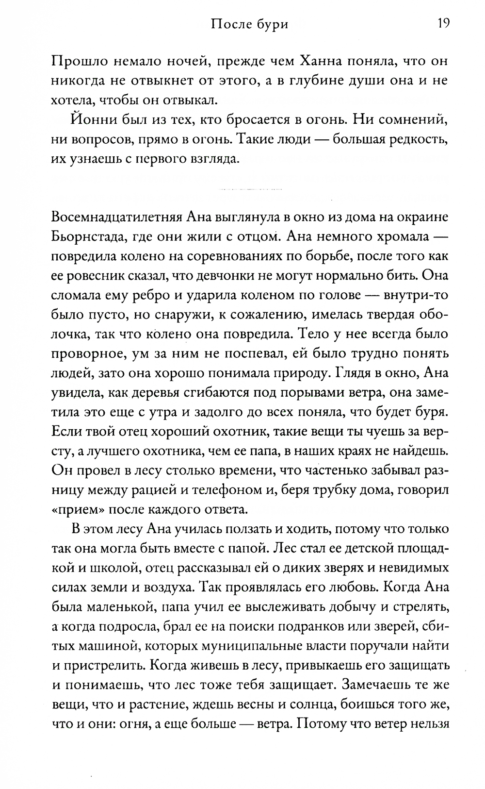«После бури» - заключительная часть трилогии о жителях двух соперничающих хоккейных городов, которой предшествуют книги «Медвежий угол» и «Мы против вас». Прошло два года после событий, о которых все стремятся забыть, чтобы двигаться дальше. Мая Андерсон и Беньи Ович возвращаются домой и воссоединяются с близкими друзьями. Они чувствуют в Бьорнстаде атмосферу оптимизма и целеустремленности, воплощением которой стал построенный на берегу озера впечатляющий ледовый дворец. Но проблемы, вызванные последствиями сильнейшей бури, вновь разжигают старое соперничество между Бьорнстадом и соседним Ходом, соперничество, которое начинается на ледовой площадке, но никогда ею не ограничивается. Нарастающая напряженность переходит во взаимное запугивание, а затем и в насилие... Всеобщая хоккейная одержимость все больше раздражает четырнадцатилетнего Маттео. Кроме того, те, кого он считает виновными в смерти сестры, - хоккеисты. Маттео полон решимости отомстить. У него есть пистолет. И план действий, осуществление которого приведет к трагедии. Эта пронзительная история предлагает нам пересмотреть свои взгляды на то, что значит победить и что значит проиграть, что значит терять и что значит прощать.| Издательство | Синдбад |