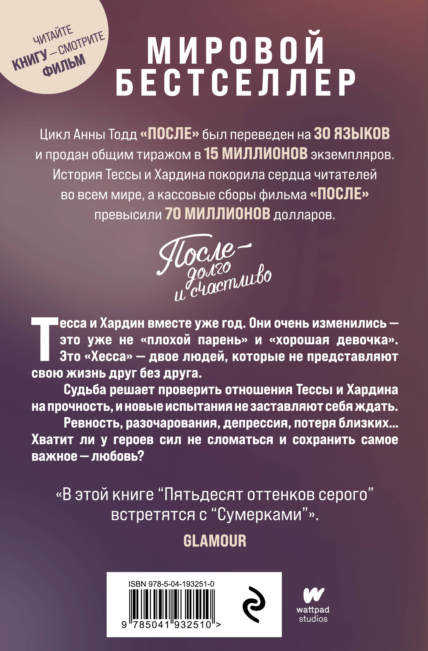 МИРОВОЙ БЕСТСЕЛЛЕР! Тетралогия «После» от Анны Тодд покорила весь мир. Цикл был переведен на 30 языков и продан общим тиражом в 15 миллионов экземпляров. История Тессы и Хардина покорила сердца читателей во всем мире, а кассовые сборы фильма «ПОСЛЕ» превысили 70 миллионов долларов. Тесса и Хардин вместе уже год. Они очень изменились - это уже не «плохой парень» и «хорошая девочка». Это «Хесса» - двое людей, которые не представляют свою жизнь друг без друга. Судьба решает проверить отношения Тессы и Хардина на прочность, и новые испытания не заставляют себя ждать. Ревность, разочарования, депрессия, потеря близких… Хватит ли у героев сил не сломаться и сохранить самое важное - любовь? «Хардин и Тесса - современные мистер Дарси и Лиззи Беннет». - That's Normal «Эта книга превзойдет ваши ожидания». - Vilma's Book Blog «Книга тронула мое сердце. Это не просто любовный роман - ведь Тессе и Хардину пришлось пройти через множество трудностей. Анна Тодд написала действительно вдохновляющую историю, которую нельзя забыть». - Amazon| Издательство | ООО "Издательство "Эксмо" |