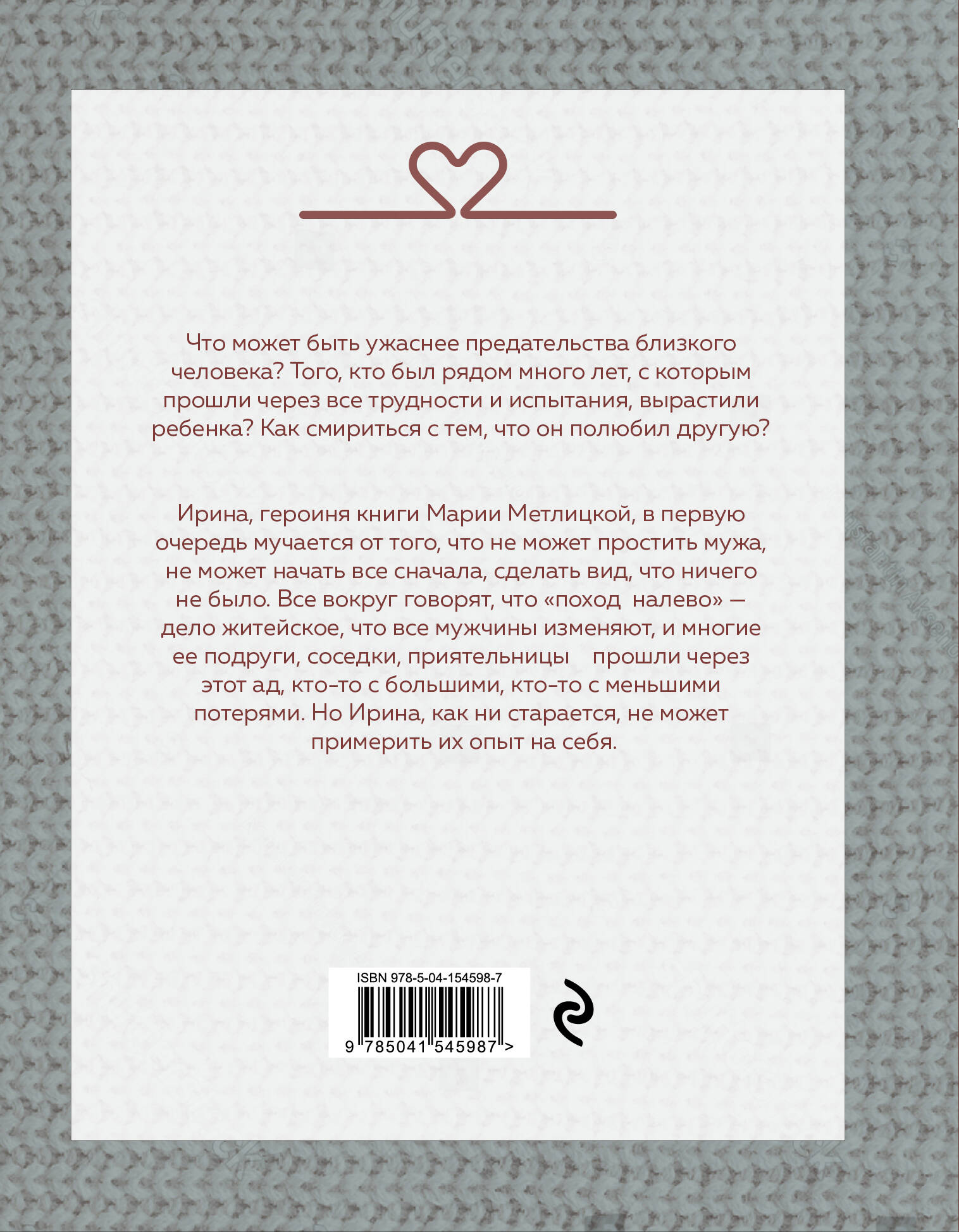 Мария Метлицкая пишет о настоящей жизни и настоящих, непридуманных людях. Их радостях, страданиях, об их проблемах и переживаниях. Что может быть ужаснее предательства близкого человека? Того, кто был рядом много лет, с которым прошли через все трудности и испытания, вырастили ребенка? Как смириться с тем, что он полюбил другую? Ирина, героиня книги Марии Метлицкой, в первую очередь мучается от того, что не может простить мужа, не может начать все с начала, сделать вид, что ничего не было. Все вокруг говорят, что «поход налево» - дело житейское, что все мужчины изменяют, и многие ее подруги, соседки, приятельницы прошли через этот ад, кто-то с большими, кто-то с меньшими потерями. Но Ирина, как ни старается, не может примерить их опыт на себя.| Издательство | ООО "Издательство "Эксмо" |