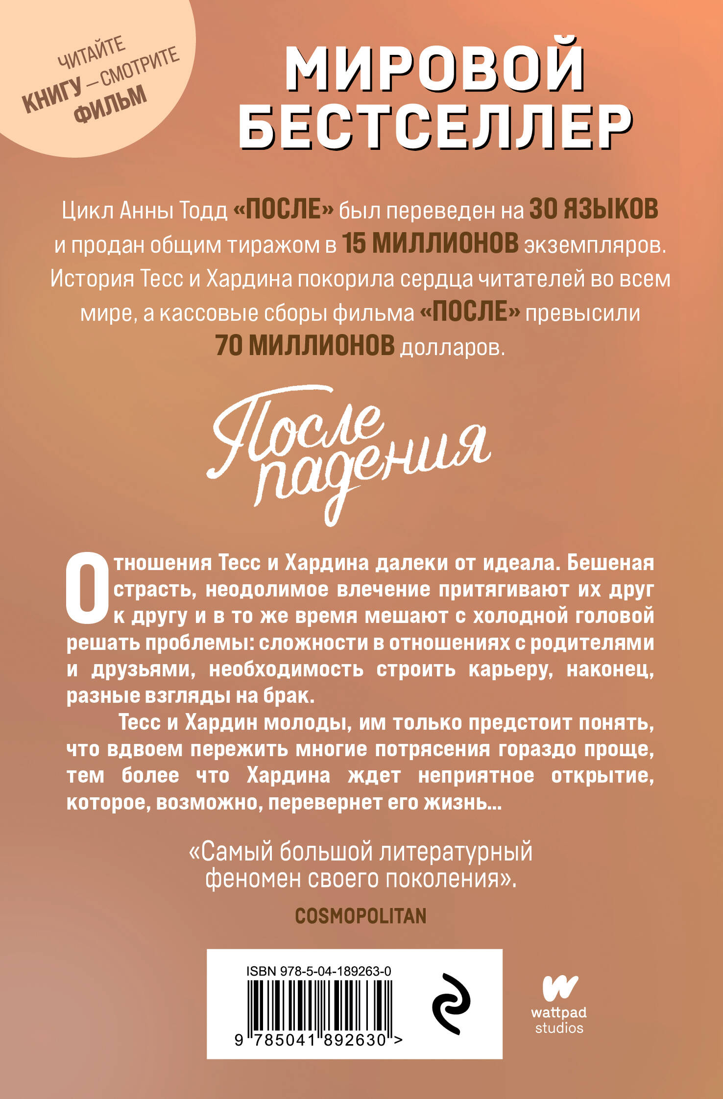 МИРОВОЙ БЕСТСЕЛЛЕР. Читайте книгу - смотрите фильм. Цикл Анны Тодд «ПОСЛЕ» был переведен на 30 языков и продан общим тиражом в 15 миллионов экземпляров. История Тессы и Хардина покорила сердца читателей во всем мире, а кассовые сборы фильма «ПОСЛЕ» превысили 70 миллионов долларов. Продолжение «После ссоры» и третья часть тетралогии «После» - все это про роман Анны Тодд «После падения». Это сейчас история любви пай-девочки Тессы и плохого парня Хардина насчитывает миллионы фанатов, а ведь Анна Тодд начинала писать на площадке Wattpad, взяв за основу главного героя образ солиста группы OneDirection Гарри Стайлза… Но произведение стало феноменом и превратилось в серию романов, которыми теперь зачитывается весь мир! Отношения Тессы и Хардина далеки от идеала. Бешеная страсть, неодолимое влечение притягивают их друг к другу и в то же время мешают с холодной головой решать проблемы: сложности в отношениях с родителями и друзьями, необходимость строить карьеру, наконец, разные взгляды на брак. Тесса и Хардин молоды, им только предстоит понять, что вдвоем пережить многие потрясения гораздо проще, тем более что Хардина ждет неприятное открытие, которое, возможно, перевернет его жизнь… «Самый большой литературный феномен своего поколения». - Cosmopolitan| Издательство | ООО "Издательство "Эксмо" |