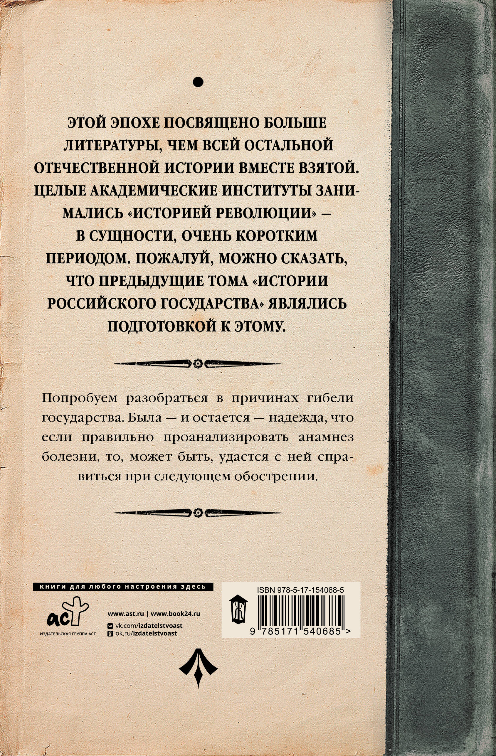 Этой эпохе посвящено больше литературы, чем всей остальной отечественной истории вместе взятой. Целые академические институты занимались "историей революции" - в сущности, очень коротким периодом. Пожалуй, можно сказать, что предыдущие тома "Истории Российского государства" являлись подготовкой к этому. Попробуем разобраться в причинах гибели государства. Была - и остается - надежда, что если правильно проанализировать анамнез болезни, то, может быть, удастся с ней справиться при следующем обострении.| Издательство | ИЗДАТЕЛЬСТВО "АСТ" |