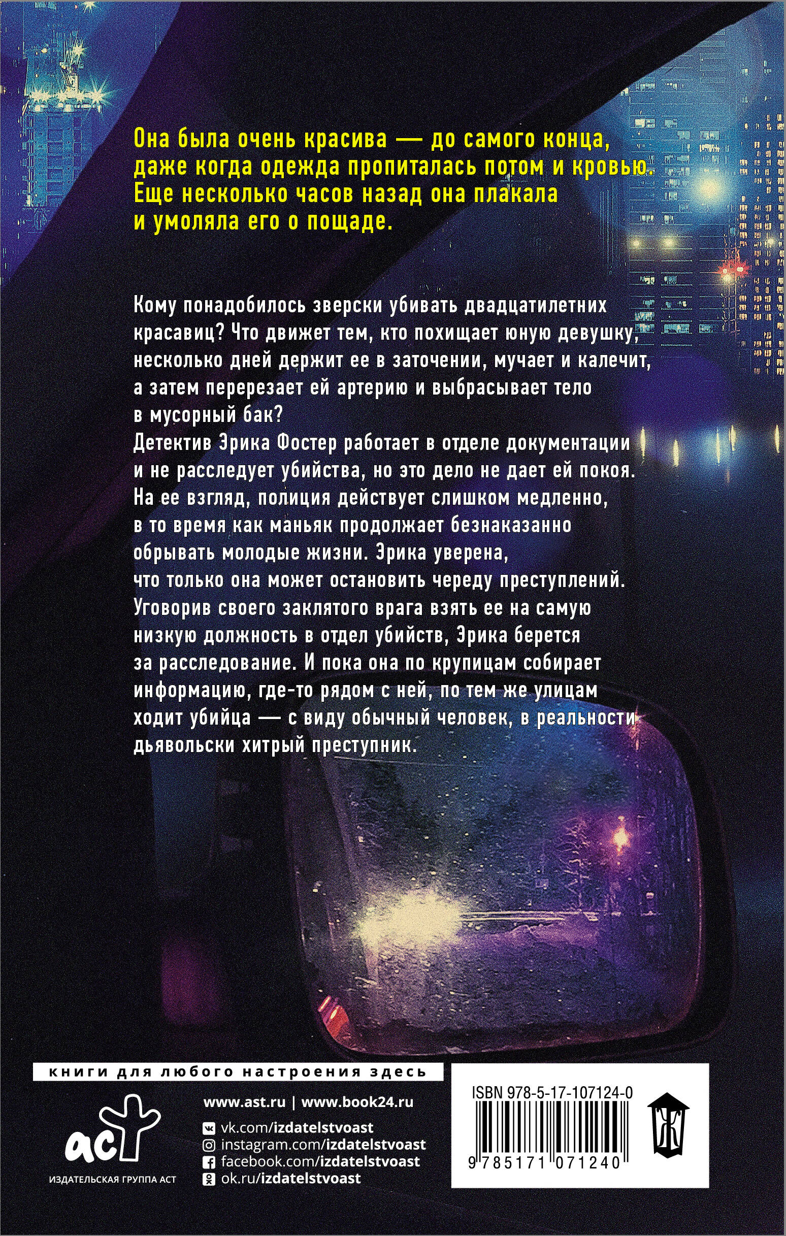 Наперегонки со временем Если полиция не может переиграть преступника, за дело должна взяться та, кто умеет выслеживать даже самого хладнокровного и аккуратного хищника. Новое расследование Эрики Фостер в остросюжетном детективном триллере Роберта Брындзы, автора бестселлера «Девушка во льду». Романы Роберта Брындзы - это головокружительный сюжет, напряженная зловещая атмосфера, оригинальные яркие персонажи, блистательные диалоги и, конечно, Эрика Фостер. Один из самых удачных главных героев в современной детективной литературе. Саркастичная, мрачноватая и обладающая совершенно сумасшедшей харизмой девушка-следователь. Сложный характер тормозит ее карьерный рост и здорово мешает в налаживании дружеских связей с людьми, но при этом именно он во многом помогает ей распутывать самые сложные дела. В новом романе Фостер встретится с, пожалуй, самым жестоким, хладнокровным и осторожным преступником в своей карьере. Сюжетные линии убийцы, выслеживающего очередную жертву, и детектива, ведущего на него охоту, разворачиваются параллельно друг другу, и это вносит в повествование еще больше напряжения и драматизма. Любая ошибка Фостер, любое неверное решение, неправильный вывод или зашедшее в тупик расследование - это дополнительное время для убийцы. А его время - это, возможно, чья-то жизнь. Ставки слишком высоки, а значит, придется рисковать.| Издательство | Издательство "АСТ" |