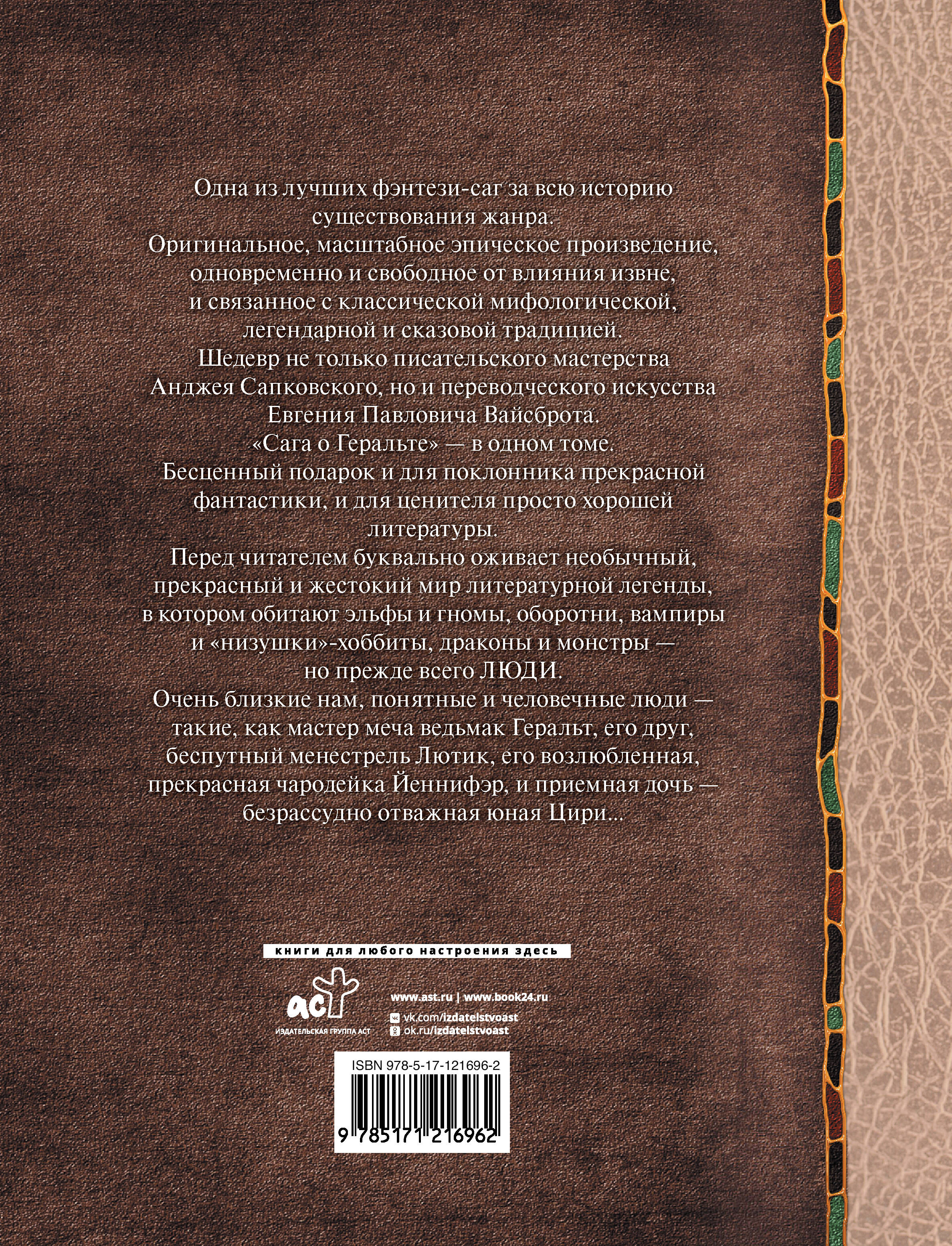 Одна из лучших фэнтези-саг за всю историю существования жанра. Оригинальное, масштабное эпическое произведение, одновременно и свободное от влияния извне, и связанное с классической мифологической, легендарной и сказовой традицией. Шедевр не только писательского мастерства Анджея Сапковского, но и переводческого искусства Евгения Павловича Вайсброта. "Сага о Геральте" - в одном томе. Бесценный подарок и для поклонника прекрасной фантастики, и для ценителя просто хорошей литературы. Перед читателем буквально оживает необычный, прекрасный и жестокий мир литературной легенды, в котором обитают эльфы и гномы, оборотни, вампиры и "низушки"-хоббиты, драконы и монстры, - но прежде всего ЛЮДИ. Очень близкие нам, понятные и человечные люди - такие как мастер меча ведьмак Геральт, его друг, беспутный менестрель Лютик, его возлюбленная, прекрасная чародейка Йеннифэр, и приемная дочь - безрассудно отважная юная Цири…| Издательство | ИЗДАТЕЛЬСТВО "АСТ" |
