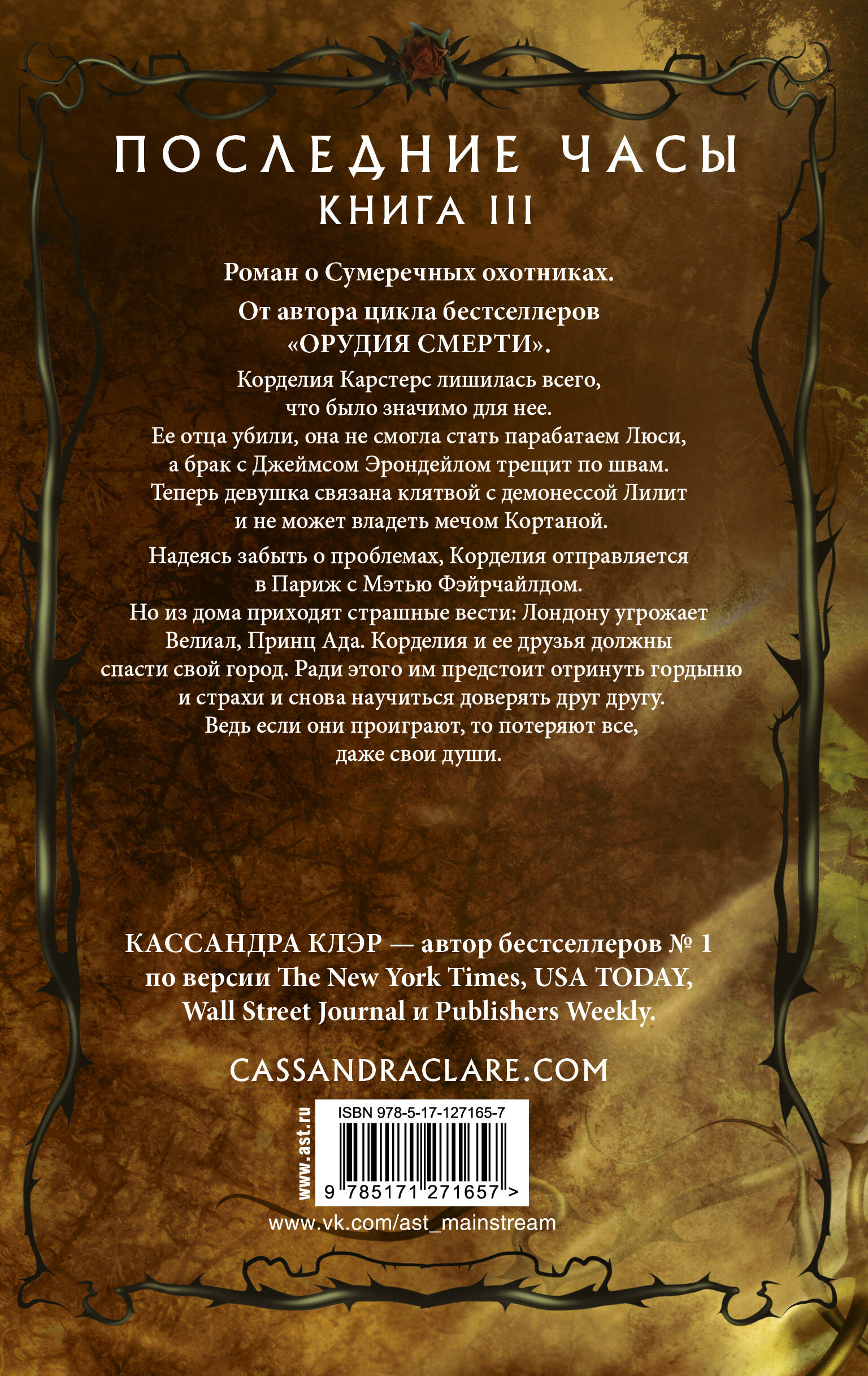 - Одна из главных премьер 2023 года - финал трилогии «Последние часы», приквела культового цикла «Орудия смерти». - Кассандра Клэр - мать young adult и городского фэнтези. У ее Сумеречных охотников, тайной расы существ с кровью ангелов, мощнейший фэндом. А романы о них не раз были экранизированы. - Бестселлер, который нужно прочитать. Книги цикла взлетели на первые места топов The New York Times и USA Today.| Издательство | Издательство "АСТ" |