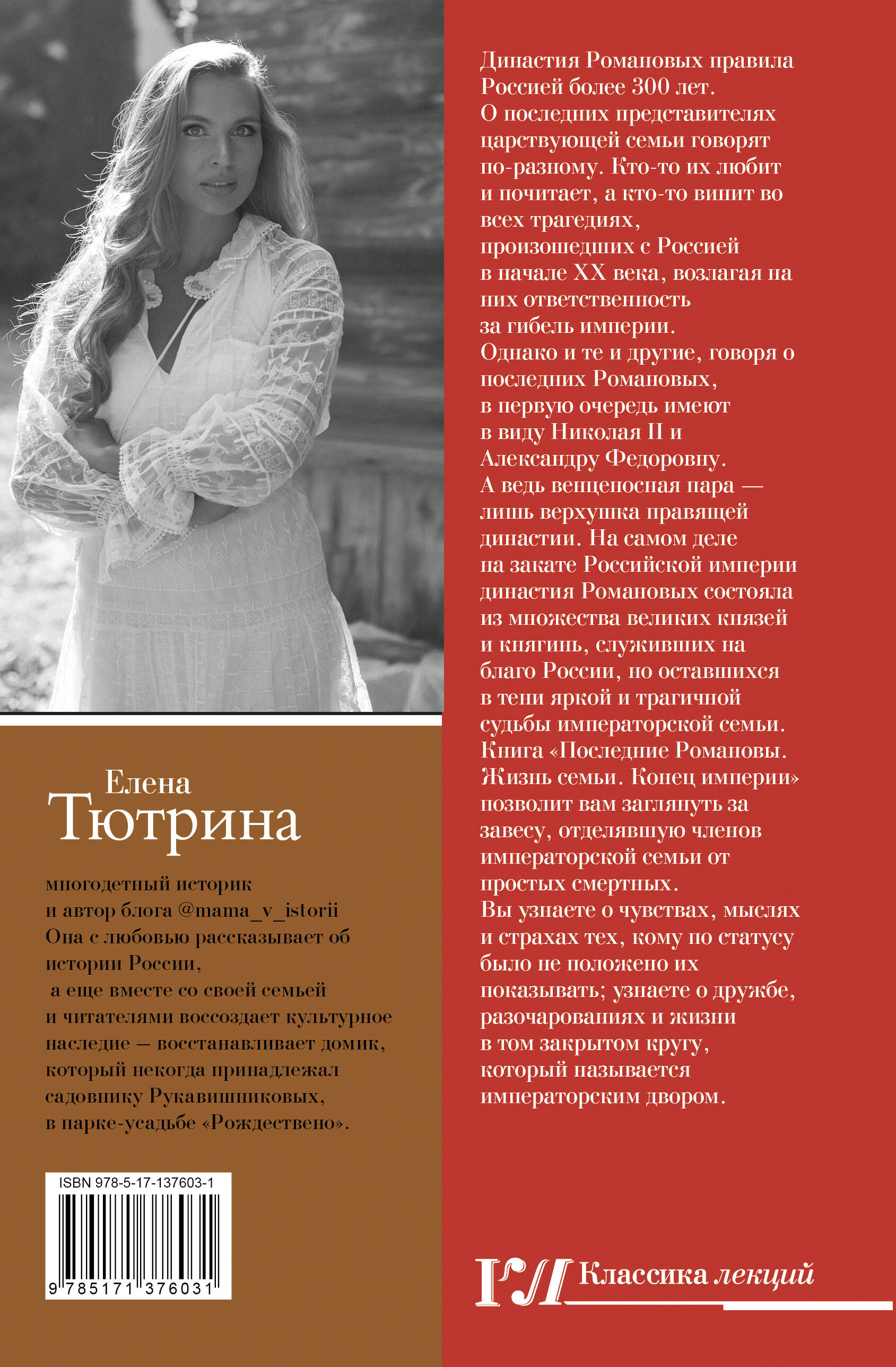 Династия Романовых правила Россией более 300 лет. О последних представителях царствующей семьи говорят по-разному. Кто-то их любит и почитает, а кто-то винит во всех трагедиях, произошедших с Россией в начале XX века, возлагая на них ответственность за гибель империи. Однако и те, и другие, говоря о последних Романовых, в первую очередь имеют в виду Николая II и Александру Федоровну. А ведь венценосная пара - лишь верхушка правящей династии. На самом деле на закате Российской империи династия Романовых состояла из множества великих князей и княгинь, служивших на благо России, но оставшихся в тени яркой и трагичной судьбы императорской семьи. Книга "Последние Романовы. Жизнь семьи. Конец империи" позволит вам заглянуть за завесу, отделявшую членов императорской семьи от простых смертных. Вы узнаете о чувствах, мыслях и страхах тех, кому по статусу было не положено их показывать; узнаете о дружбе, разочарованиях и жизни в том закрытом кругу, который называется императорским двором. Елена Тютрина - многодетный историк и автор блога @mama_v_istorii. Она с любовью рассказывает об истории России, а еще вместе со своей семьей и читателями воссоздает культурное наследие - восстанавливает домик, который некогда принадлежал садовнику Рукавишниковых в парке-усадьбе "Рождествено".| Издательство | Издательство "АСТ" |
