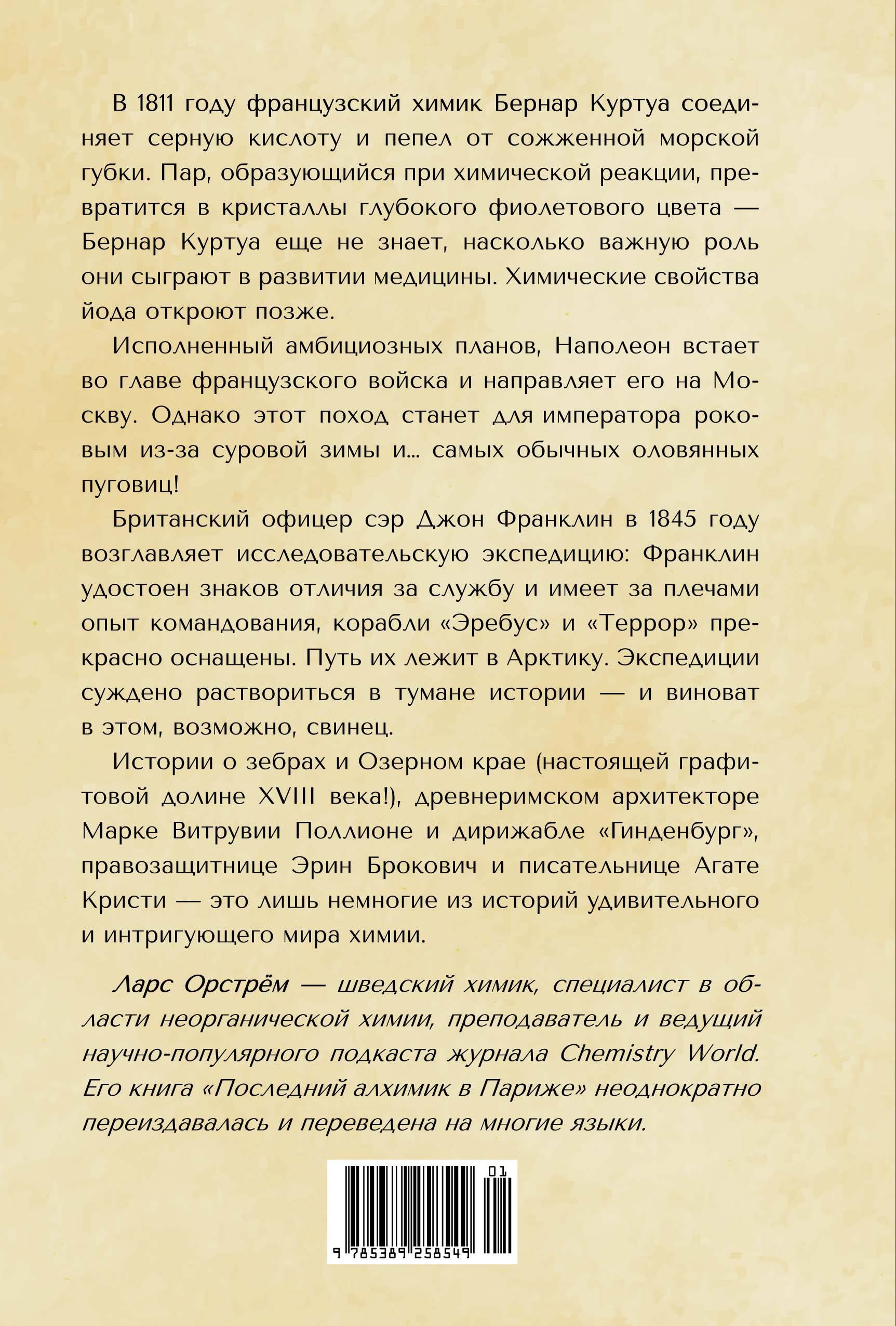 Химия окружает нас повсюду: вся история человечества - это история химии, химических открытий и катастроф, изобретений и научного прогресса, применения химических знаний во благо и во зло, в мирное время и на поле боя. В этой книге шведский ученый Ларс Орстрём приглашает читателя погрузиться в поразительный и завораживающий мир химии - от реакций и элементов, составляющих периодическую таблицу Менделеева, до монархов, промышленных шпионов и великих исследователей прошлого. Какую роль жидкость для снятия лака сыграла в Первой мировой войне? Как связаны история водорода и трагедия дирижабля "Гинденбург"? И почему Агата Кристи обязана своей блестящей карьерой химическому элементу брому? В повествовании Ларса Орстрёма тесно переплелись история науки и основные химические законы, свойства элементов и увлекательные (а порой и пугающие) судьбы людей. "Это истории о приключениях, успехах и неудачах обычных и необычных людей со всего света, которые намеренно встречались или случайно сталкивались с различными химическими элементами" (Ларс Орстрём). Ранее книга издавалась в серии "Исторический интерес" под заголовком "Химия навсегда: О гороховом супе, опасности утреннего кофе и пробе мистера Марша".| Издательство | Азбука-Аттикус Издат.группа ООО |