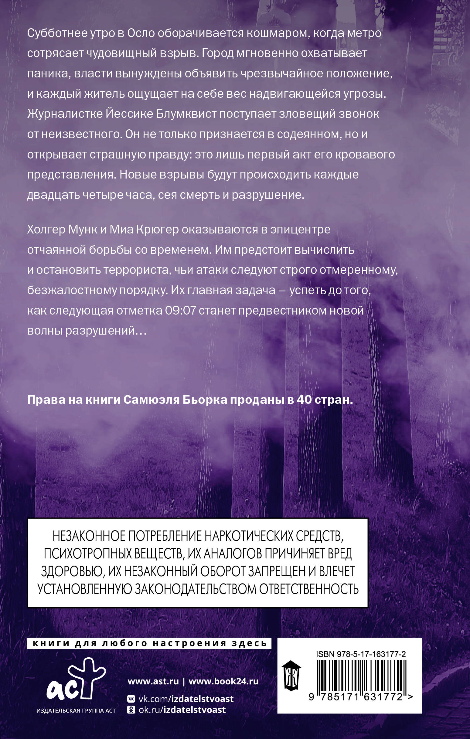 НЕЗАКОННОЕ ПОТРЕБЛЕНИЕ НАРКОТИЧЕСКИХ СРЕДСТВ, ПСИХОТРОПНЫХ ВЕЩЕСТВ, ИХ АНАЛОГОВ ПРИЧИНЯЕТ ВРЕД ЗДОРОВЬЮ, ИХ НЕЗАКОННЫЙ ОБОРОТ ЗАПРЕЩЕН И ВЛЕЧЕТ УСТАНОВЛЕННУЮ ЗАКОНОДАТЕЛЬСТВОМ ОТВЕТСТВЕННОСТЬ. - Настоящий скандинавский триллер, в котором мрачная атмосфера сочетается с эмоциональной глубиной и интригующим расследованием. - Возвращение к полюбившимся героям - Холгеру Мунку и Мии Крюгер: детективы сталкиваются с делом, способным разрушить всё, во что они верят. - Динамичный сюжет, в котором каждое новое событие отбрасывает свет на неочевидные детали прошлого. Маньяк выбирает жертв не случайно - он мстит тем, кто, по его мнению, однажды причинил ему боль. - Пронзительный финал, оставляющий горько-сладкое послевкусие - вроде бы всё разрешилось, но не без потерь. - Великолепные описания норвежской природы придают повествованию кинематографичность. - Ранее в серии вышли: «Я путешествую одна», «Сова», «Мальчик в свете фар», «Белая как снег», «Хитра».| Издательство | Издательство "АСТ" |