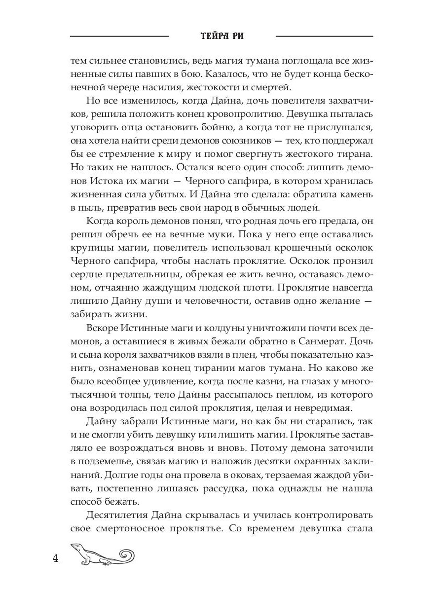 Дайна -- демон, последняя представительница некогда могущественного народа, чью магию породил Хаос. Ее жизненный путь залит кровью и усеян трупами, а имя давным-давно стало синонимом жестокости, страха, боли и лишений во всех пяти королевствах. Она -- повелительница Санмерата -- места, которое стало домом всем наемникам, преступникам и изгнанникам. Больше тысячелетия назад ее лишили души и обрекли на вечную жизнь, наделив неуемной жаждой убивать. С тех пор она ищет способ избавиться от проклятия и обрести покой.