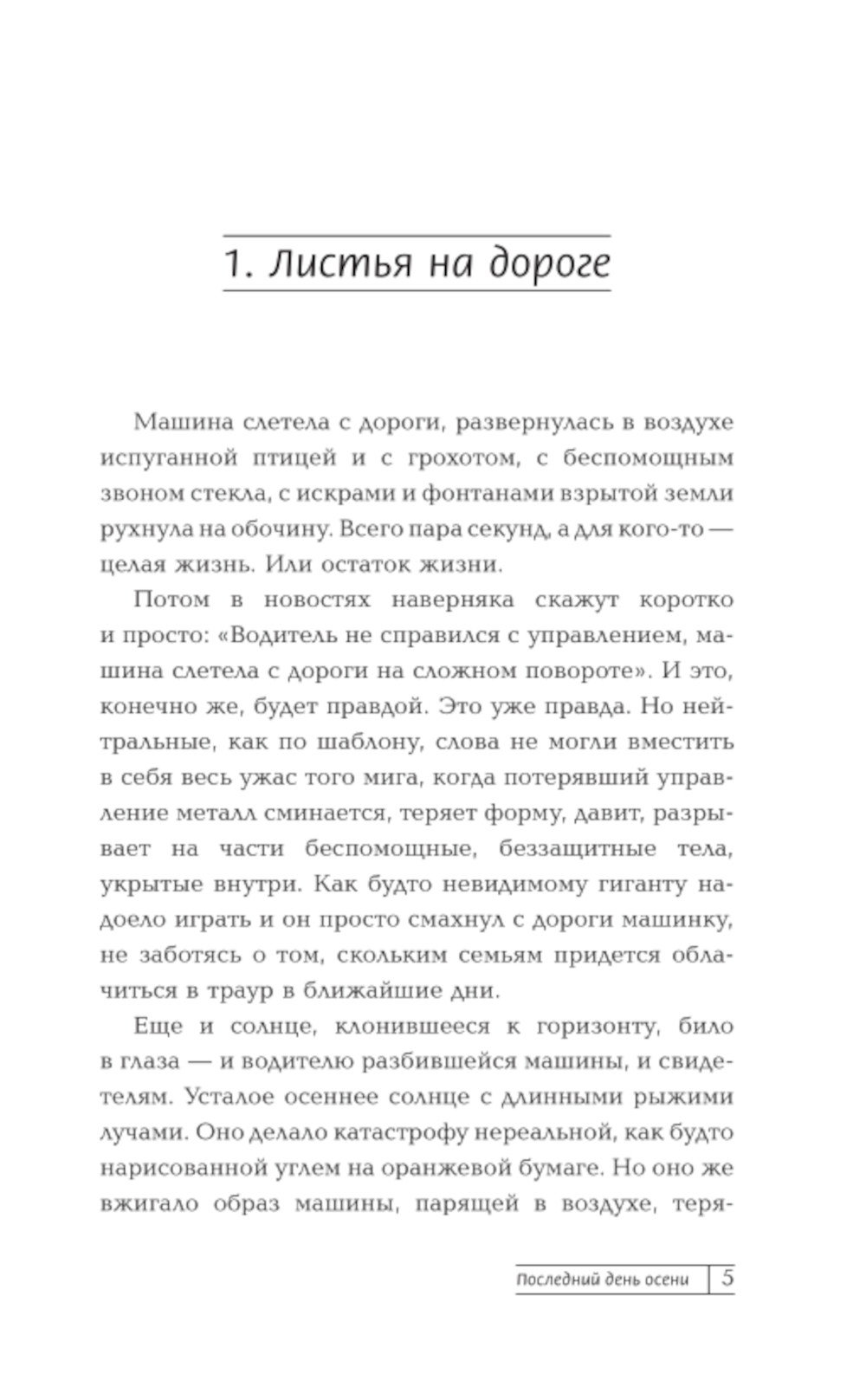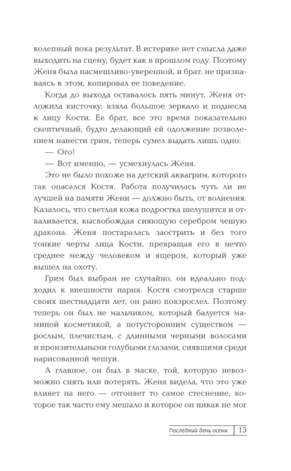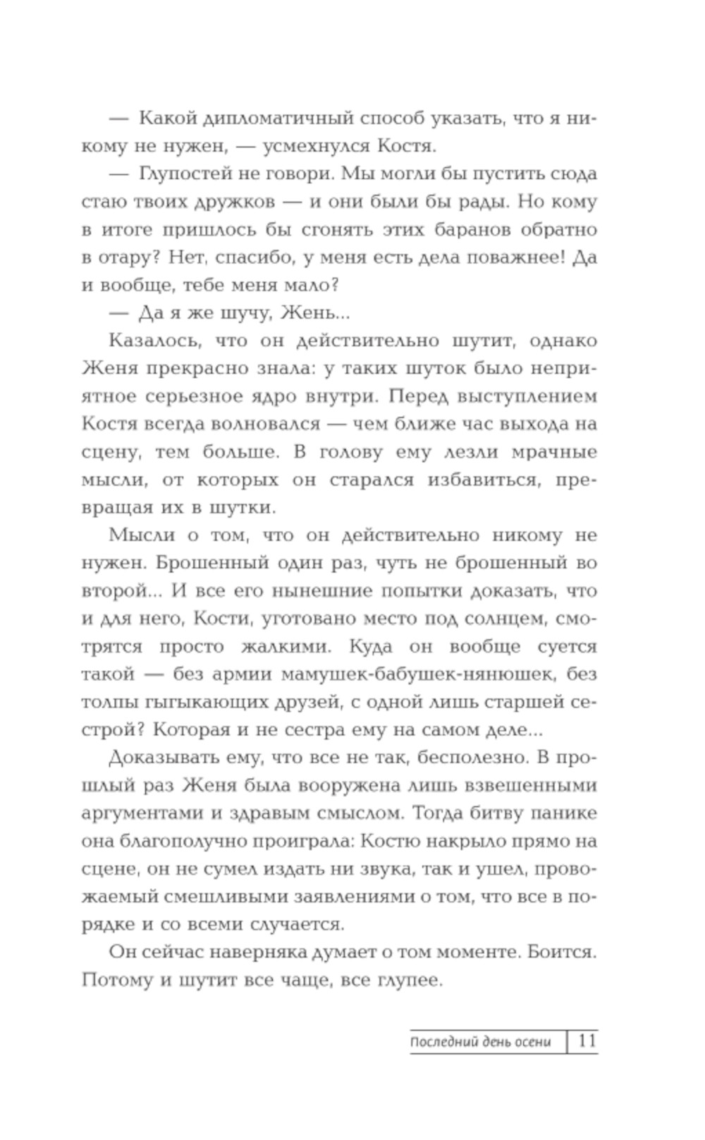 Не зря говорят, что за блеском и яркостью шоу скрываются настоящие трагедии. Костя, талантливый юный певец, оказался втянут в интриги, происходящие вокруг престижного музыкального конкурса, где игра на выбывание ведется всерьез. На его сестру Женю тем временем совершено покушение. Связаны ли эти случаи? Кто ее таинственный спаситель и почему он следит за девушкой? Пришло время ответов, ведь наступил день, который решает все - последний день осени.| Издательство | АСТ |