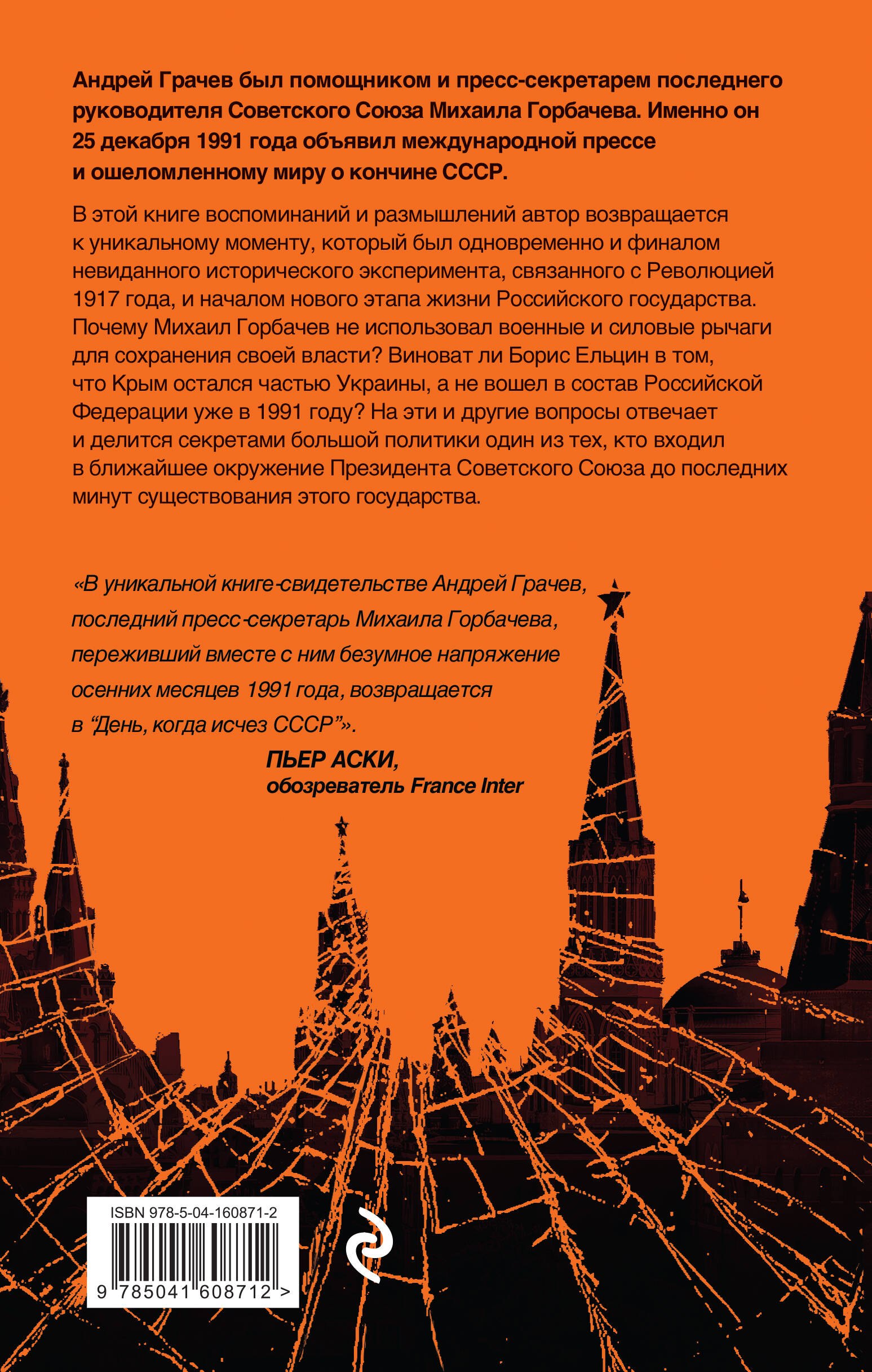 Андрей Грачев был помощником и пресс-секретарем последнего руководителя Советского Союза Михаила Горбачева. Именно он 25 декабря 1991 года объявил международной прессе и ошеломленному миру о кончине СССР. В этой книге воспоминаний и размышлений автор возвращается к уникальному моменту, который был одновременно и финалом невиданного исторического эксперимента, связанного с революцией 1917 года, и началом нового этапа жизни Российского государства. Почему Михаил Горбачев не использовал военные и силовые рычаги для сохранения своей власти? Виноват ли Борис Ельцин в том, что Крым остался частью Украины, а не вошел в состав Российской Федерации уже в 1991 году? На эти и другие вопросы отвечает и делится секретами большой политики один из тех, кто входил в ближайшее окружение Президента Советского Союза до последних минут существования этого государства. Прошло три десятилетия - своей книгой-некрологом Андрей Серафимович Грачев окончательно провожает СССР в историю и предлагает взглянуть в будущее. Без страха, но и без иллюзий. -------------------------------- «В уникальной книге-свидетельстве Андрей Грачев, последний пресс-секретарь Михаила Горбачева, переживший вместе с ним безумное напряжение осенних месяцев 1991 года, возвращается в "День, когда исчез СССР"». - ПЬЕР АСКИ, обозреватель France Inter «"Я ощущал дыхание Истории", - признается Андрей Грачев, который в своей книге рассказывает о последних днях Советской Империи и размышляет о месте России в современном мире». - ВЕРОНИКА ДОРМАН, корреспондент газеты Libération| Издательство | Эксмо |