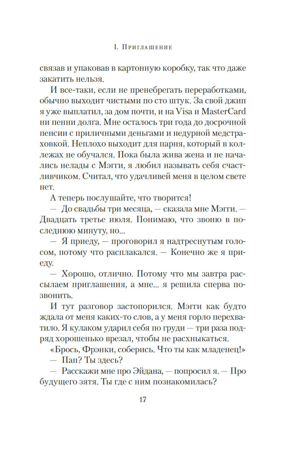 В захолустном городке Фрэнк Шатовски добросовестно трудится водителем службы доставки и только себя винит в разрыве с дочерью, которая теперь живет в Бостоне. И вот наконец, после трехлетнего молчания, звонок от Мэгги. И ошеломляющее предложение: приехать к ней на свадьбу и провести ее к алтарю. Отец безмерно рад такой возможности восстановить отношения с дочерью. Но перед самым отъездом он получает анонимное письмо с фотоснимком, на котором жених, сын владельца крупной фирмы, где работает Мэгги, стоит в обнимку с другой девушкой. А в письме одна-единственная фраза: «Где Дон Таггарт»? Фрэнк отправляется в путь, но тревожные сведения о будущем зяте заставляют его задуматься: уж не совершает ли его дочь роковую ошибку?| Издательство | Азбука |