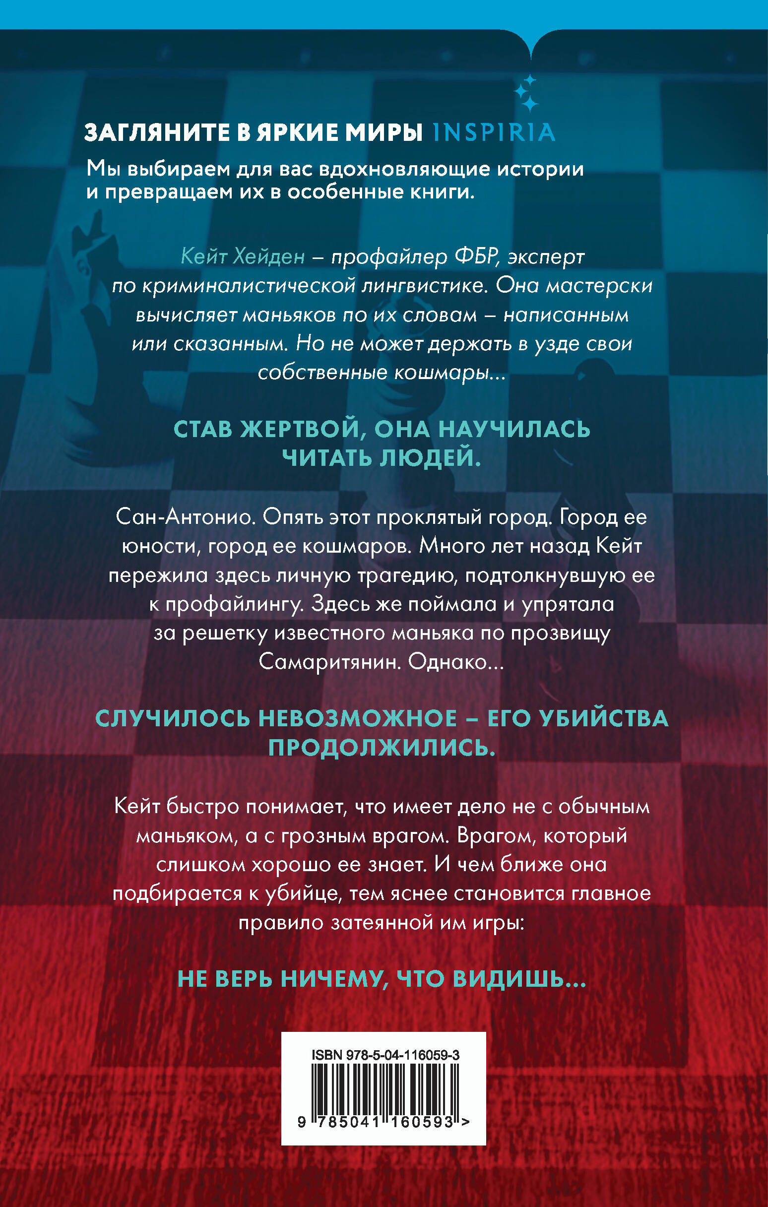 От автора бестселлеров New York Times и USA Today. Для нее охота на серийных убийц - как игра в шахматы. Понять тактику противника, просчитать его действия на несколько шагов вперед и заманить в ловушку. Но он - достойный соперник, и еще неизвестно, чей ход будет последним. Кейт Хейден - профайлер ФБР, эксперт по криминалистической лингвистике. Она мастерски вычисляет маньяков по их словам - написанным или сказанным. Но не может держать в узде свои собственные кошмары… СТАВ ЖЕРТВОЙ, ОНА НАУЧИЛАСЬ ЧИТАТЬ ЛЮДЕЙ. Сан-Антонио. Опять этот проклятый город. Город ее юности, город ее кошмаров. Много лет назад Кейт пережила здесь личную трагедию, подтолкнувшую ее к профайлингу. Здесь же поймала и упрятала за решетку известного маньяка по прозвищу Самаритянин. Однако… СЛУЧИЛОСЬ НЕВОЗМОЖНОЕ - ЕГО УБИЙСТВА ПРОДОЛЖИЛИСЬ. Кейт быстро понимает, что имеет дело не с обычным маньяком, а с грозным врагом. Врагом, который слишком хорошо ее знает. И чем ближе она подбирается к убийце, тем яснее становится главное правило затеянной им игры: НЕ ВЕРЬ НИЧЕМУ, ЧТО ВИДИШЬ… Роман в духе «Внутри убийцы» и культового фильма «Имитатор» с Сигурни Уивер, положившего начало голливудской моде на профайлеров.