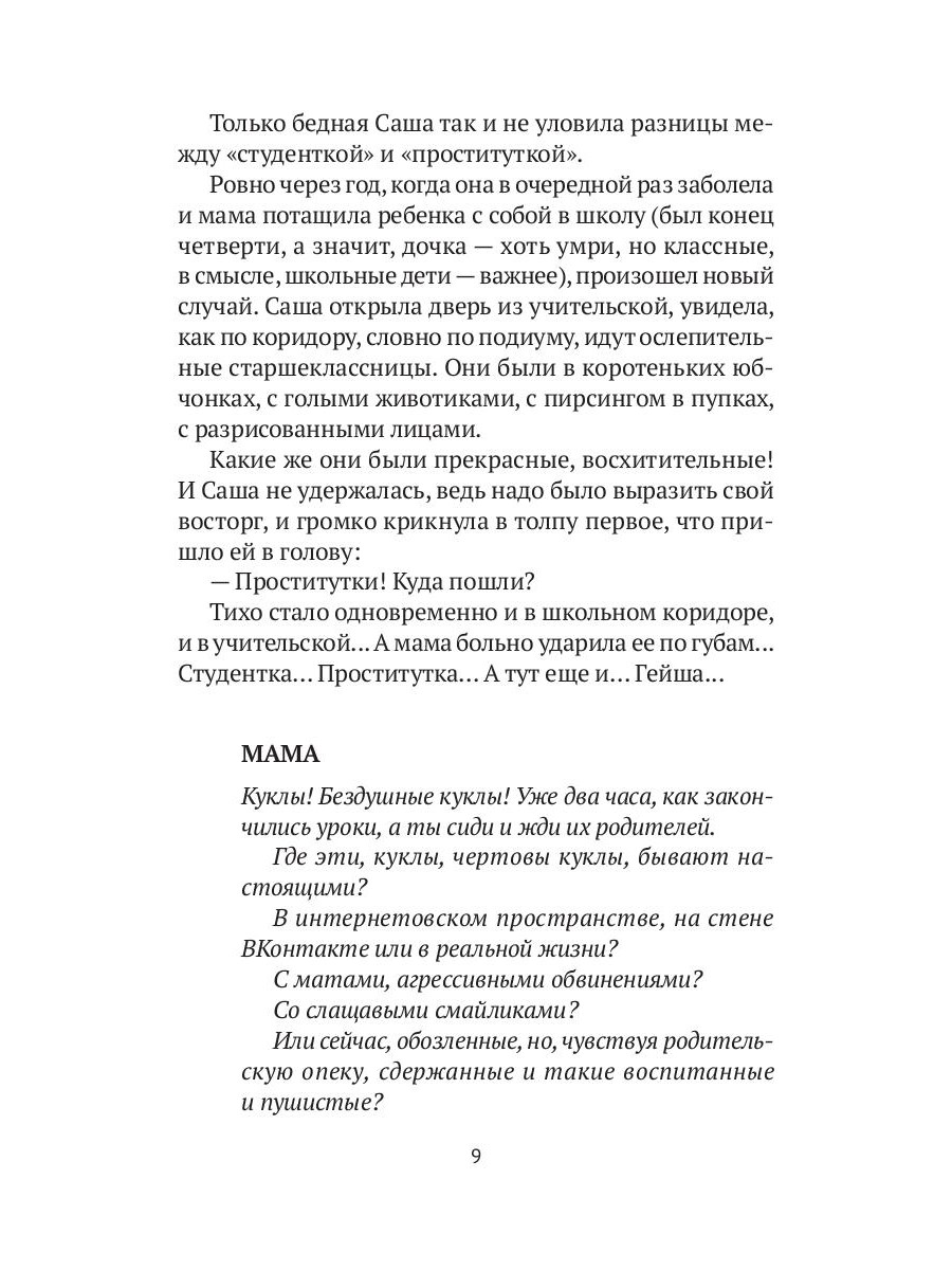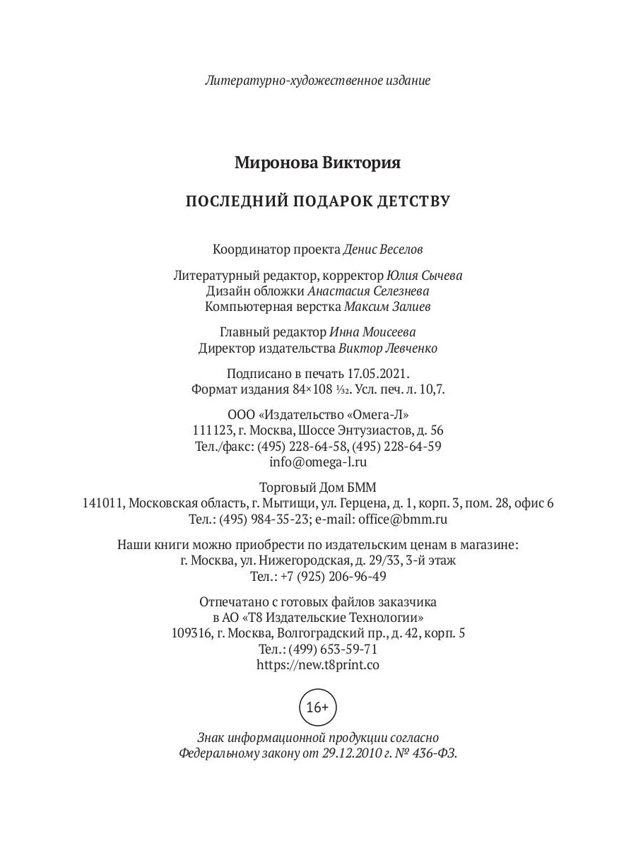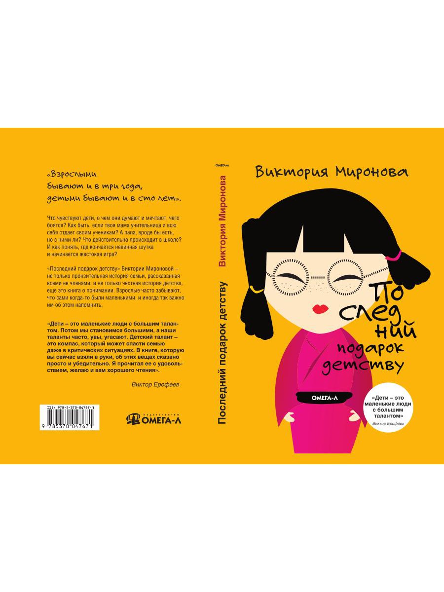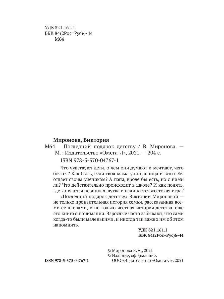 Что чувствуют дети, о чем они думают и мечтают, чего боятся? Как быть, если твоя мама учительница и всю себя отдает своим ученикам? А папа, вроде бы есть, но с ними ли? Что действительно происходит в школе? И как понять, где кончается невинная шутка и начинается жестокая игра? «Последний подарок детству» Виктории Мироновой - не только пронзительная история семьи, рассказанная всеми ее членами, и не только честная история детства, еще это книга о понимании. Взрослые часто забывают, что сами когда-то были маленькими, и иногда так важно им об этом напомнить.| Издательство | Омега-Л |