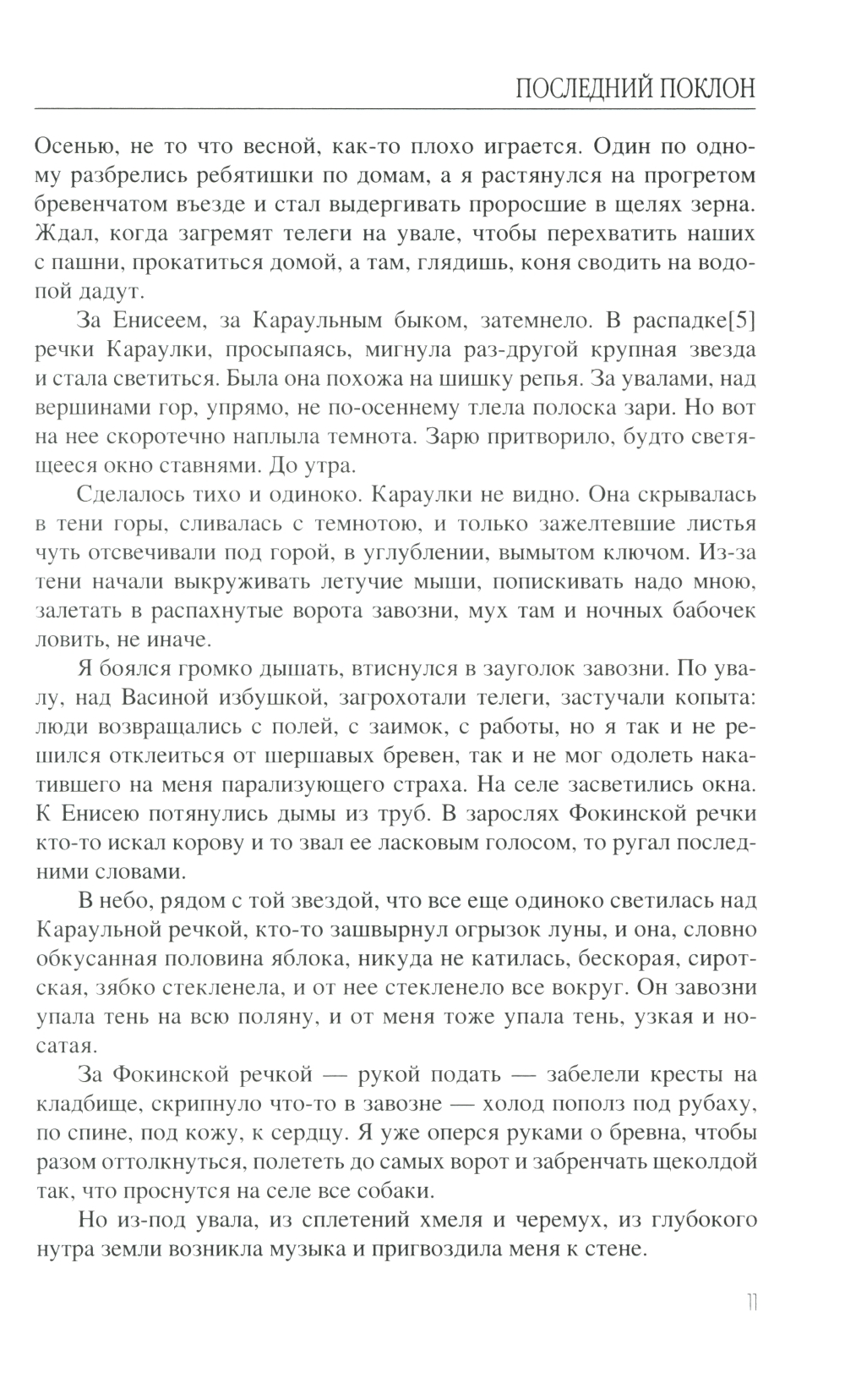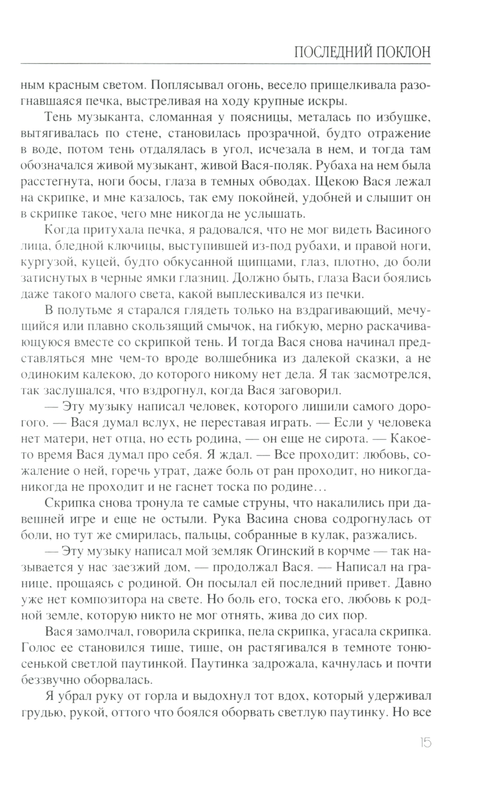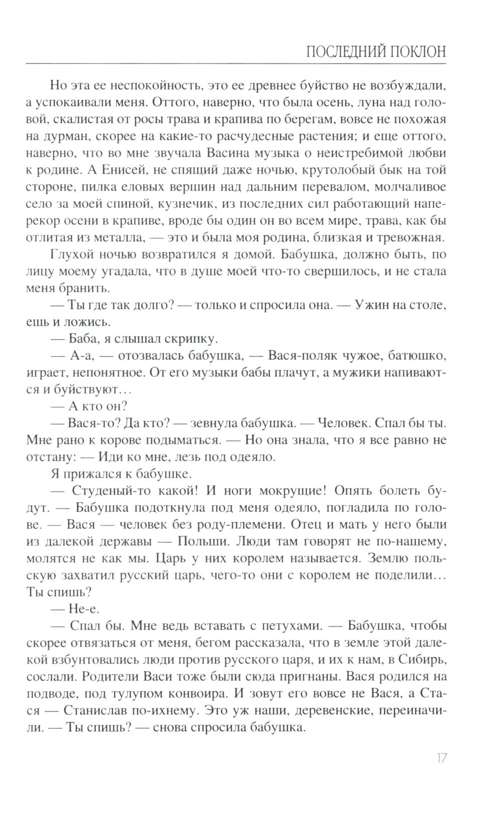 Автобиографическая повесть «Последний поклон» известного советского и российского писателя Виктора Петровича Астафьева (1924-2001) посвящена истории духовного роста, формированию высоких моральных качеств и мужанию молодого человека на протяжении 1930-1990-х годов XX века. Фактически это исповедь тех поколений. Проникновенно, с большой жизненной достоверностью и философской направленностью автор поднимает актуальные социально-нравственные проблемы, которые стоят перед нашим современником, ведет взволнованный разговор об истоках русской души и сибирского характера.