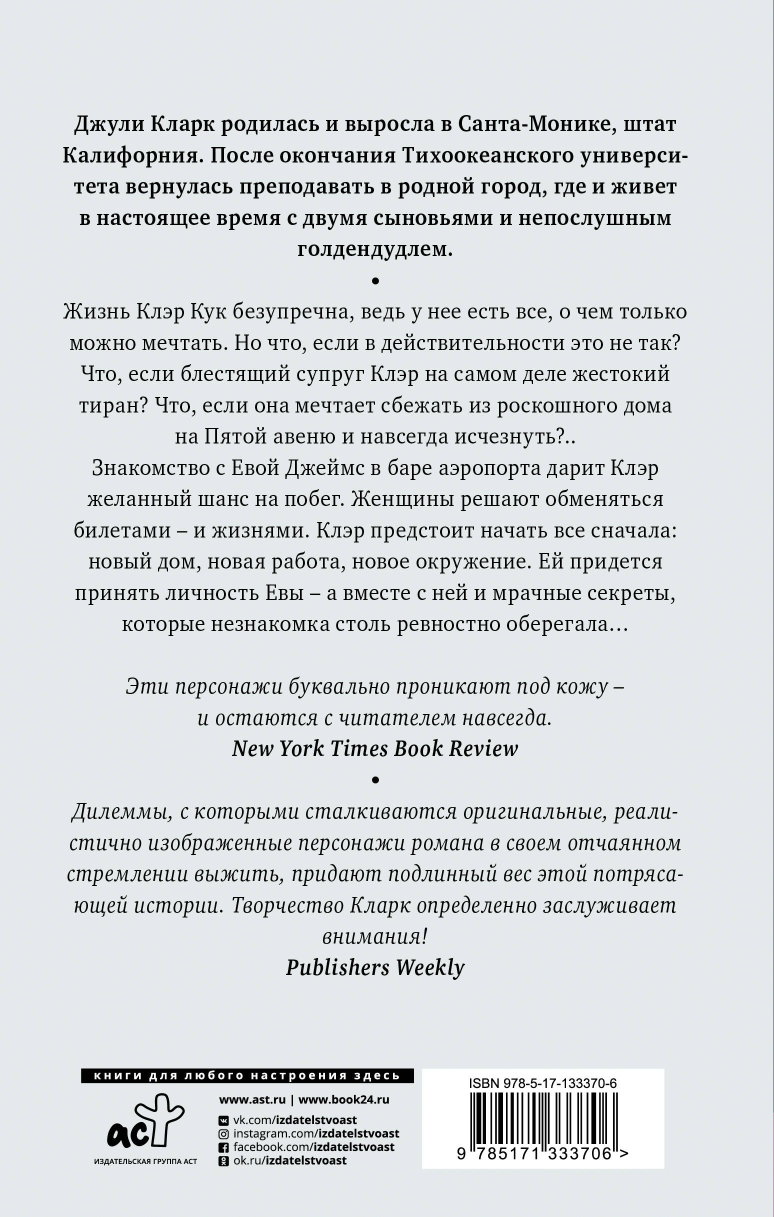 Международный хит. Роман Джули Кларк «Последний рейс» попал в списке бестселлеров по версии изданий «New-York Times» и «USA Today» и был призан лучшей книгой года по версии интернет-гиганта Amazon. Это яркая, эмоциональная, захватывающая и напряжённая история с изобретательными поворотами сюжета и уязвимыми персонажами. Это история двух женщин, одиноких и напуганных, и одного мучительного решения, которое навсегда изменит их жизнь. Клэр Кук и Ева Джеймс случайно встречаются в аэропорту. На первый взгляд, Клэр живёт идеальной и успешной жизнью, но по правде говоря, она жутко несчастно и мечтает начать новую жизнь. И случайная встреча даёт шанс именно на это. Клэр меняется с Евой билетами и летит совершенно в другое место, но обстоятельства складываются так, что Клэр приходится перенять личность Евы, вместе со всеми мрачными секретами, о которых женщина даже не догадывалась. Каково это, жить под чужим именем и притворяться человеком, которого даже не знаешь? И долго ли это сможет продолжаться? «Последний рейс» держит читателя в напряжении до самой последней страницы. Рекомендуется всем поклонникам творчества Лайзы Джуэлл и Лив Константин и бестселлера «Исчезнувшая».