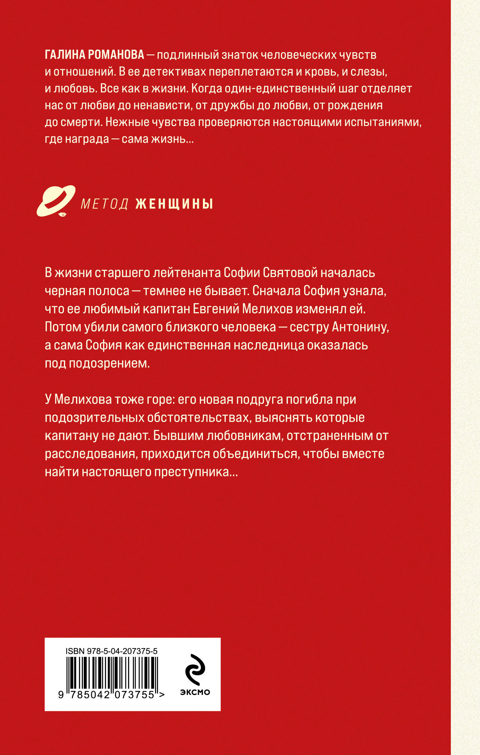 В жизни старшего лейтенанта Софии Святовой началась черная полоса - темнее не бывает. Сначала София узнала, что ее любимый капитан Евгений Мелихов изменял ей. Потом убили самого близкого человека - сестру Антонину, а сама София как единственная наследница оказалась под подозрением. У Мелихова тоже горе: его новая подруга погибла при подозрительных обстоятельствах, выяснять которые капитану не дают. Бывшим любовникам, отстраненным от расследования, приходится объединиться, чтобы вместе найти настоящего преступника… Новая книга Галины Романовой - очень интригующая и трогательная история о том, насколько мы ответственны за то, что делаем со своей собственной жизнью. Несколько увлекательных сюжетных линий, повествующих о судьбах разных людей, развиваются параллельно, чтобы в финале сплестись в тугой узел, когда все тайны будут раскрыты, а злодеи выведены на чистую воду.| Издательство | ООО "Издательство "Эксмо" |