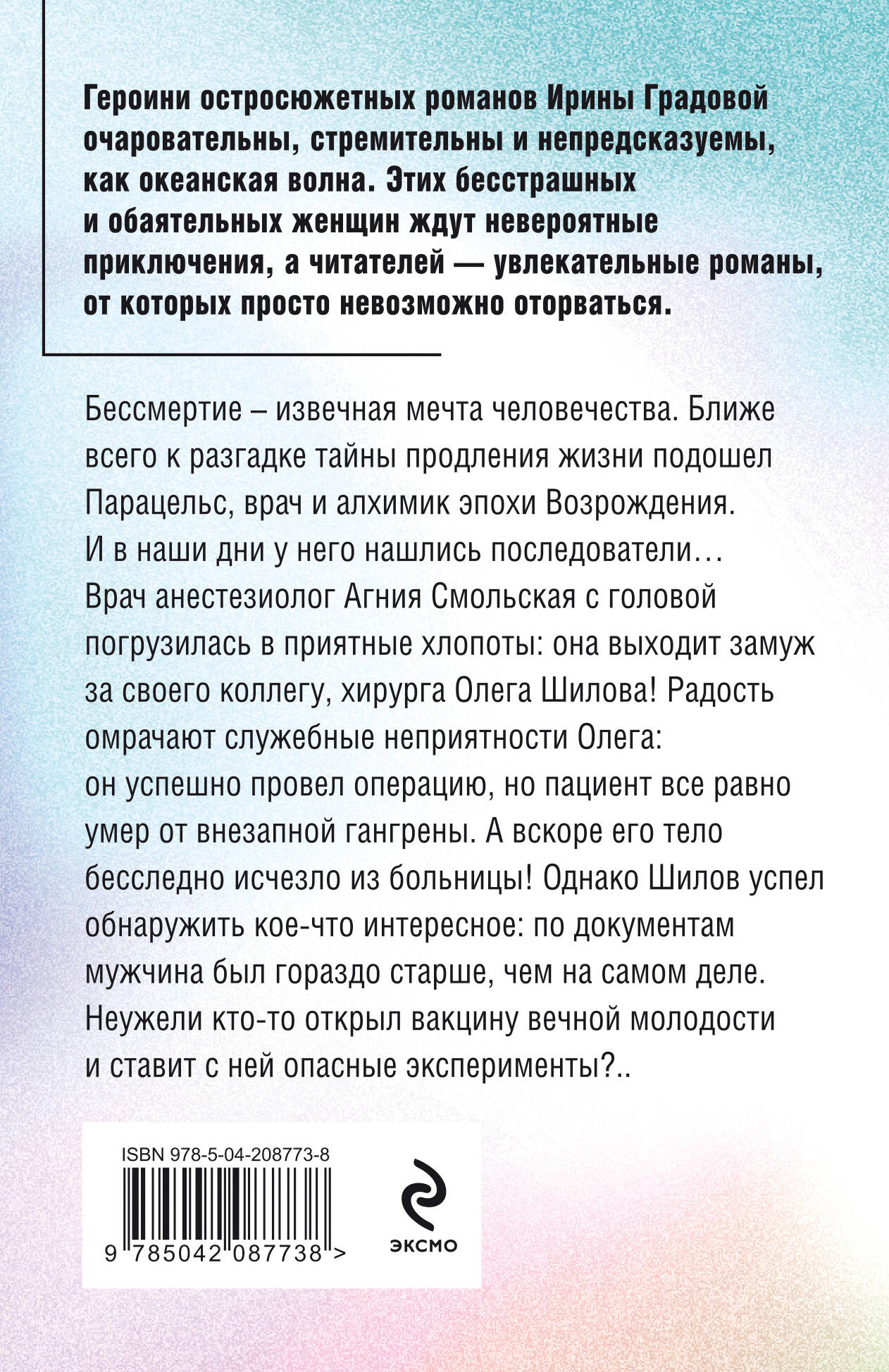 Бессмертие - извечная мечта человечества. Ближе всего к разгадке тайны продления жизни подошел Парацельс, врач и алхимик эпохи Возрождения. И в наши дни у него нашлись последователи… Врач-анестезиолог Агния Смольская с головой погрузилась в приятные хлопоты: она выходит замуж за своего коллегу, хирурга Олега Шилова! Радость омрачают служебные неприятности Олега: он успешно провел операцию, но пациент все равно умер от внезапной гангрены. А вскоре его тело бесследно исчезло из больницы! Однако Шилов успел обнаружить кое-что интересное: по документам мужчина был гораздо старше, чем на самом деле. Неужели кто-то открыл вакцину вечной молодости и ставит с ней опасные эксперименты?.. Героини остросюжетных романов Ирины Градовой очаровательны, стремительны и непредсказуемы, как океанская волна - самая настоящая стихия. Этих бесстрашных и обаятельных женщин ждут невероятные приключения, а читателей - увлекательные романы, от которых просто невозможно оторваться.| Издательство | ООО "Издательство "Эксмо" |