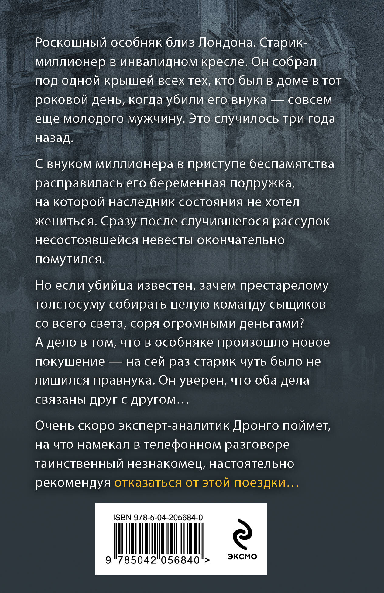 Роскошный особняк близ Лондона. Старик-миллионер в инвалидном кресле. Он собрал под одной крышей всех тех, кто был в доме в тот роковой день, когда убили его внука - совсем еще молодого мужчину. Это случилось три года назад. С внуком миллионера в приступе беспамятства расправилась его беременная подружка, на которой наследник состояния не хотел жениться. Сразу после случившегося рассудок несостоявшейся невесты окончательно помутился. Но если убийца известен, зачем престарелому толстосуму собирать целую команду сыщиков со всего света, соря огромными деньгами? А дело в том, что в особняке произошло новое покушение - на сей раз старик чуть было не лишился правнука. Он уверен, что оба дела связаны друг с другом… Очень скоро эксперт-аналитик Дронго поймет, на что намекал в телефонном разговоре таинственный незнакомец, настоятельно рекомендуя отказаться от этой поездки…| Издательство | ООО "Издательство "Эксмо" |