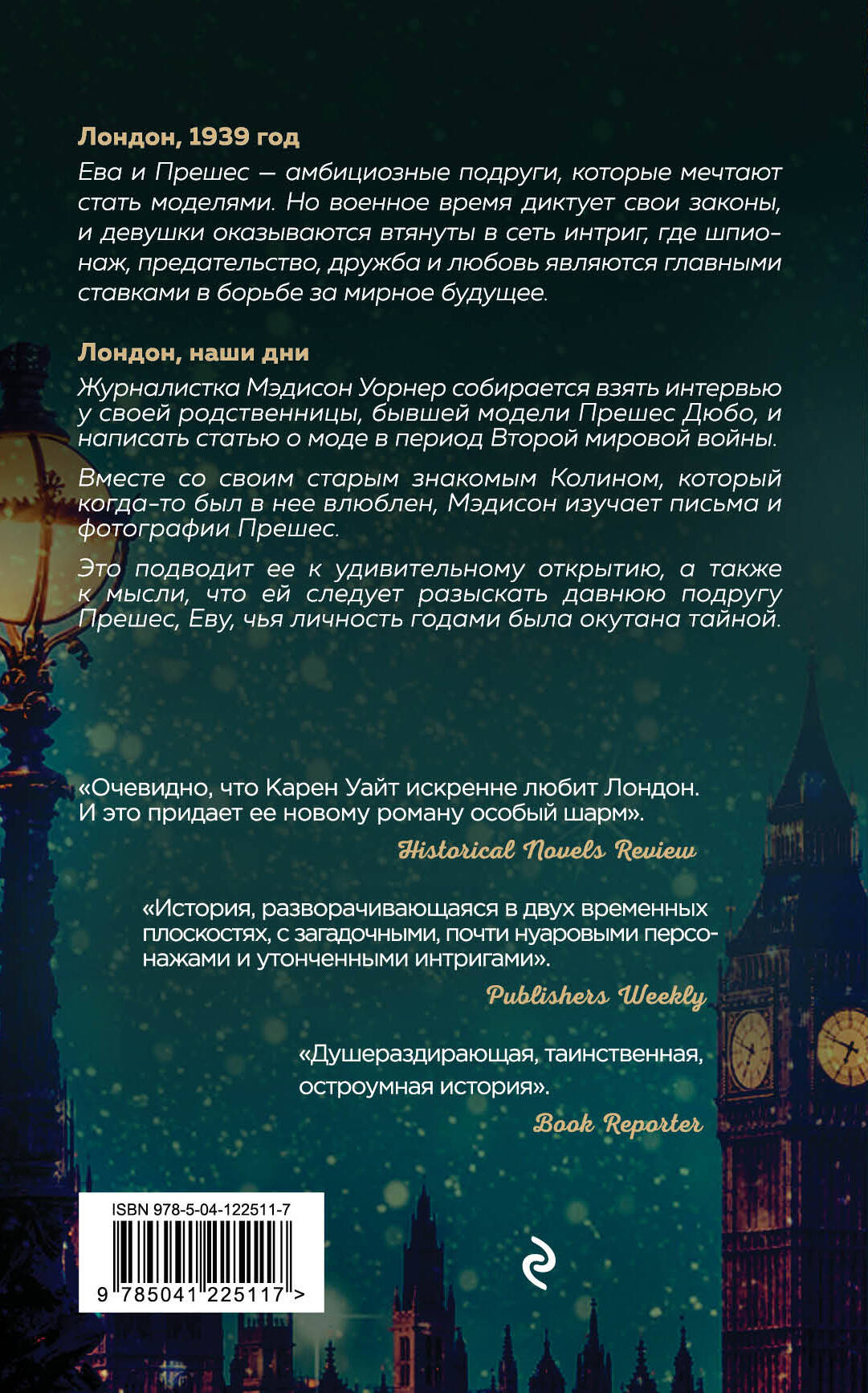 Лондон, 1939 год Ева и Прешес - амбициозные подруги, которые мечтают стать моделями. Но военное время диктует свои законы, и девушки оказываются втянуты в сеть интриг, где шпионаж, предательство, дружба и любовь являются главными ставками в борьбе за мирное будущее. Лондон, наши дни Журналистка Мэдисон Уорнер собирается взять интервью у своей родственницы, бывшей модели Прешес Дюбо, и написать статью о моде в период Второй мировой войны. Вместе со своим старым знакомым Колином, который когда-то был в нее влюблен, Мэдисон изучает письма и фотографии Прешес. Это подводит ее к удивительному открытию, а также к мысли, что ей следует разыскать давнюю подругу Прешес, Еву, чья личность годами была окутана тайной. *** Карен Уайт - многократный лауреат премии «The Best Romance Writer of America». Ее романы издаются во всем мире, в них гармонично сочетаются романтика и загадка. На настоящий момент вышло более 20 книг автора, тираж которых превысил 1 000 000 экземпляров.| Издательство | ООО "Издательство "Эксмо" |