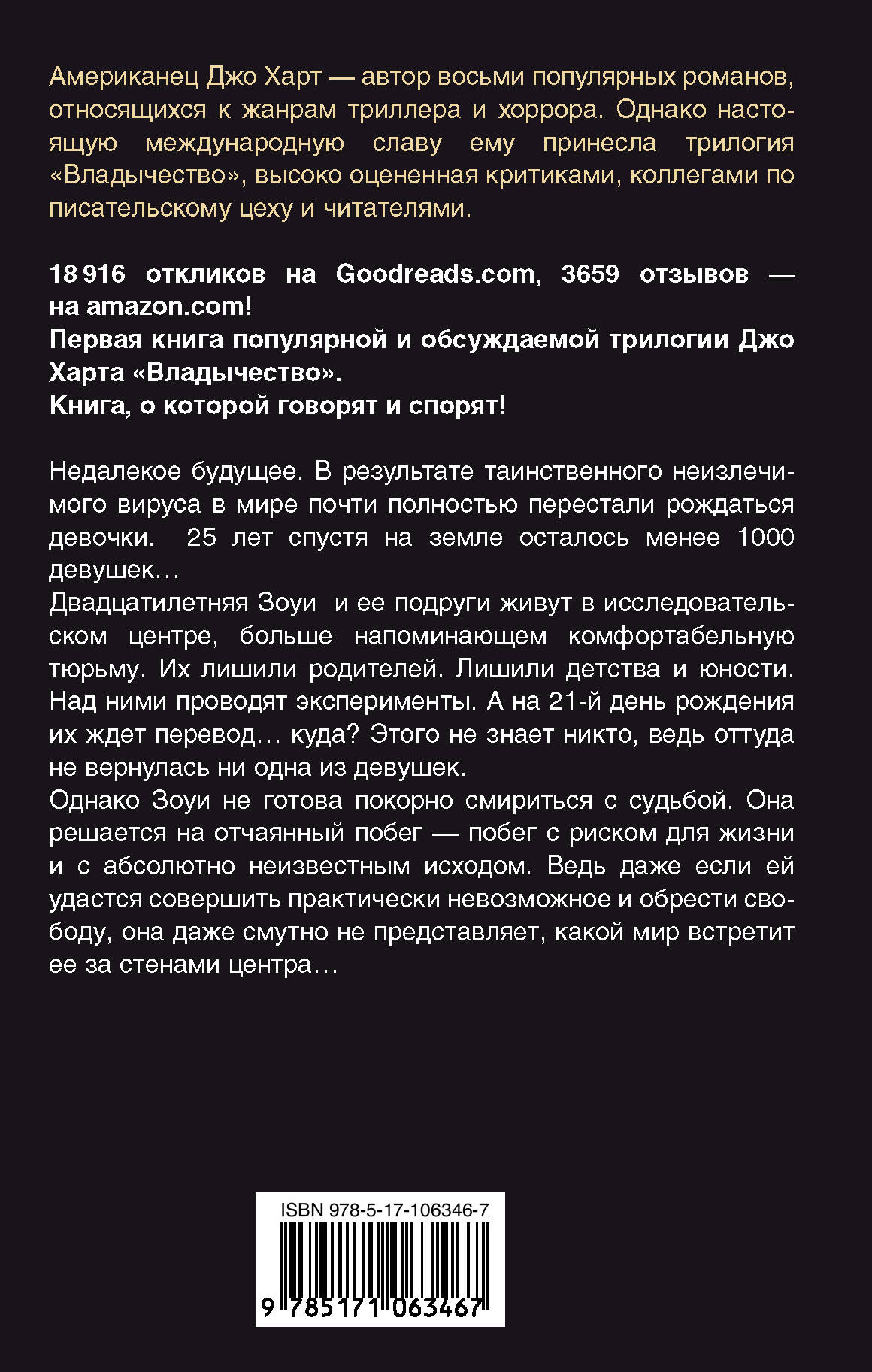 Недалекое будущее. В результате таинственного неизлечимого вируса в мире почти полностью перестали рождаться девочки. 25 лет спустя на Земле осталось менее 1000 девушек… Двадцатилетняя Зоуи и ее подруги живут в исследовательском центре, больше напоминающем комфортабельную тюрьму. Их лишили родителей. Лишили детства и юности. Над ними проводят эксперименты. А на 21-й день рождения их ждет перевод… куда? Этого не знает никто, ведь оттуда не вернулась ни одна из девушек. Однако Зоуи не готова покорно смириться с судьбой. Она решается на отчаянный побег - побег с риском для жизни и абсолютно неизвестным исходом. Ведь даже если ей удастся совершить практически невозможное и обрести свободу, она даже смутно не представляет, какой мир встретит ее за стенами центра…| Издательство | ИЗДАТЕЛЬСТВО "АСТ" |