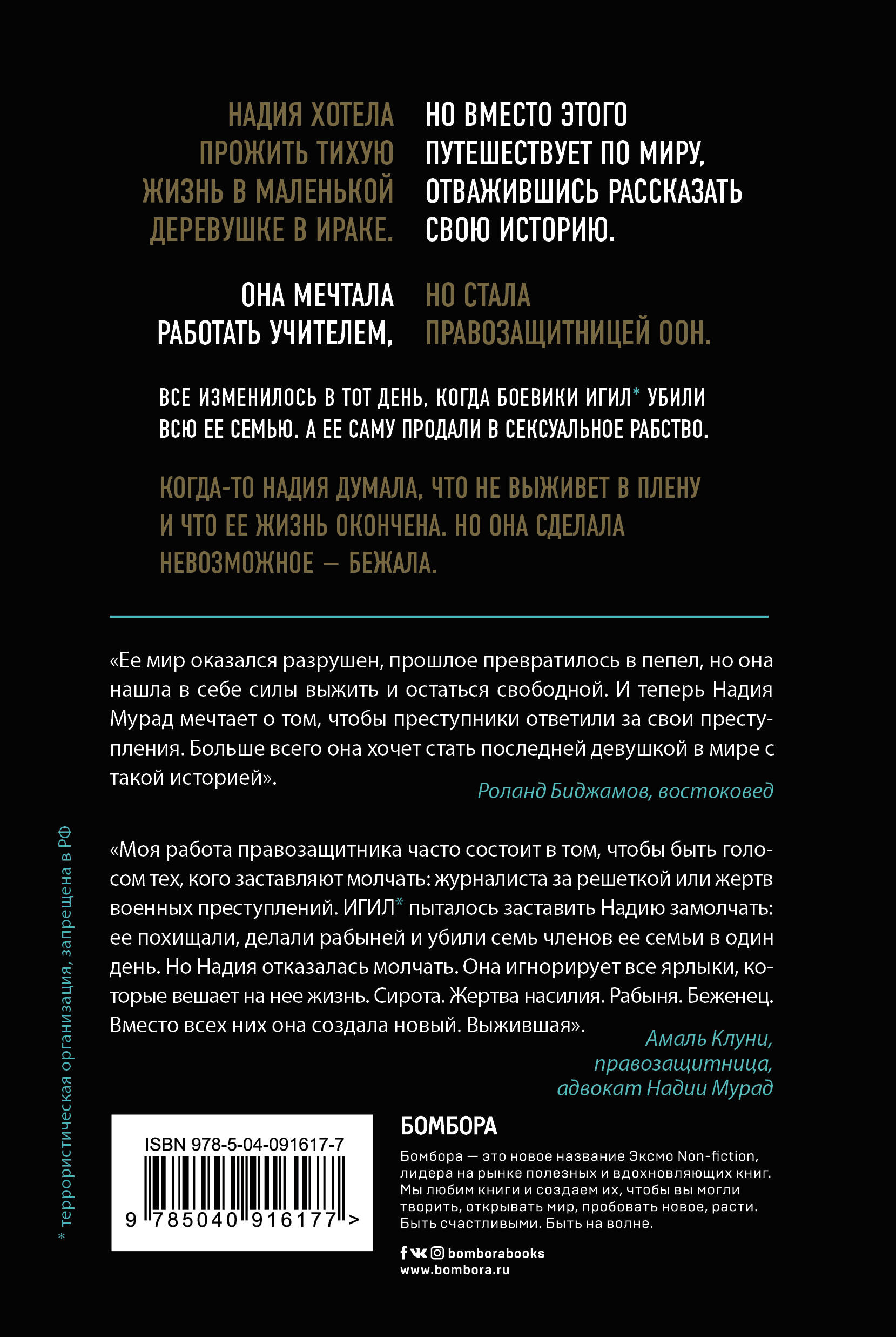 ОБ АВТОРЕ Надия Мурад - лауреат Нобелевской премии мира, иракская правозащитница езидского происхождения, Посол доброй воли управления ООН по наркотикам и преступности, лауреат премии Вацлава Гавела по правам человека и премии Андрея Сахарова за свободу мысли. В 2016 году Надия вошла в список 100 самых влиятельных людей мира по версии журнала Time. О КНИГЕ Реальная история выживания в плену «Исламского государства» в 2014 году. Права проданы в 23 страны. Предисловие Амаль Клуни. Амаль - адвокат, правозащитница ООН, жена актера и режиссера Джорджа Клуни. Надия хотела прожить тихую жизнь в маленькой деревушке в Ираке. Но вместо этого путешествует по миру, отважившись рассказать свою историю. Она мечтала работать учителем, но стала правозащитницей ООН. Все изменилось в тот день, когда боевики ИГИЛ убили всю ее семью. А ее саму продали в сексуальное рабство. Когда-то Надия думала, что не выживет в плену и что ее жизнь окончена. Но она сделала невозможное - бежала. ОТЗЫВЫ «Ее мир оказался разрушен, прошлое превратилось в пепел, но она нашла в себе силы выжить и остаться свободной. И теперь Надия Мурад мечтает о том, чтобы преступники ответили за свои преступления. Больше всего она хочет стать последней девушкой в мире с такой историей». - Роланд Биджамов, востоковед «Моя работа правозащитника часто состоит в том, чтобы быть голосом тех, кого заставляют молчать: журналиста за решеткой или жертв военных преступлений, которые отвоевывают свои дни в суде. Нет сомнения, что ИГИЛ пыталось заставить Надию замолчать: ее похищали, делали рабыней, насиловали, пытали, убили семь членов ее семьи в один день. Но Надия отказалась молчать. Она игнорирует все ярлыки, которые вешает на нее жизнь. Сирота. Жертва насилия. Рабыня. Беженец. Вместо всех них она создала новый. Выжившая». - Амаль Клуни, правозащитница, адвокат Надии Мурад| Издательство | ООО "Издательство "Эксмо" |