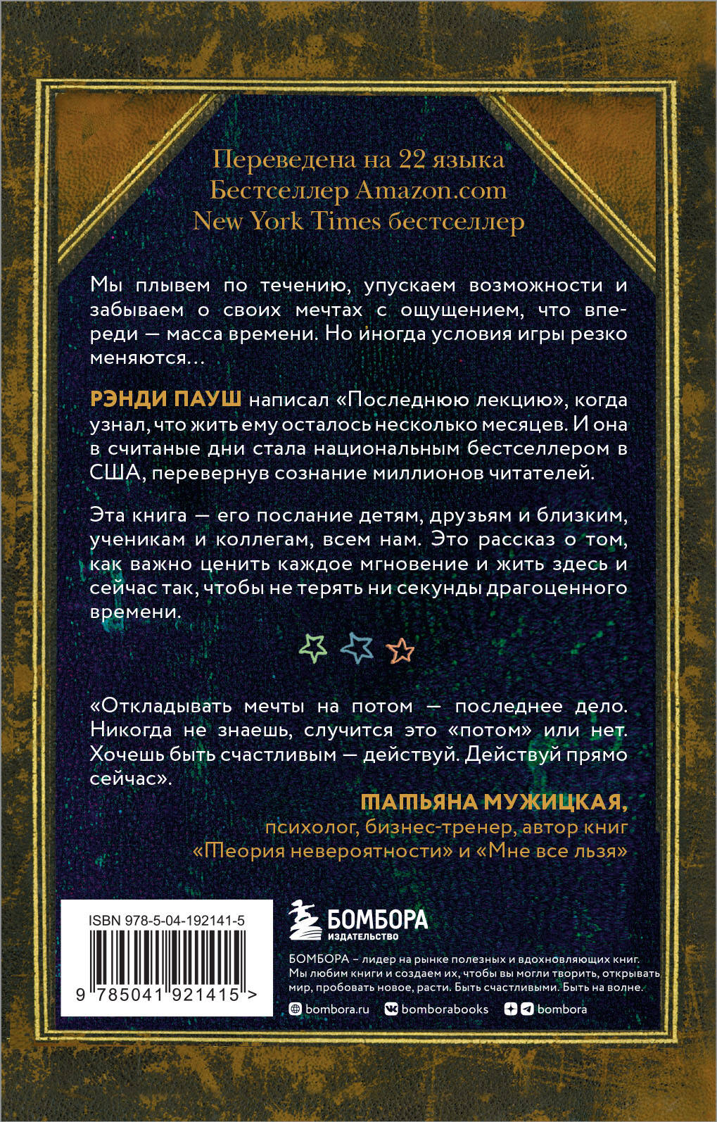 «Сданные нам карты сменить нельзя, но разыграть их можно по своему усмотрению». - Рэнди Пауш МЕЖДУНАРОДНЫЙ БЕСТСЕЛЛЕР. БОЛЕЕ 15 МИЛЛИОНОВ ПРОДАННЫХ ЭКЗЕМПЛЯРОВ ПО ВСЕМУ МИРУ. Что в нашей жизни действительно важно, а что - лишь бестолковая суета? Как надо жить, что делать, чтобы потом не жалеть о напрасно потерянном времени, несбывшихся мечтах, нереализованных возможностях? Очень часто мы не задумываемся об этом, плывем по течению, барахтаемся в рутине с ощущением, что впереди - масса времени. Но иногда условия игры резко меняются... Рэнди Пауш написал «Последнюю лекцию», когда узнал, что жить ему осталось несколько месяцев. И она в считанные дни стала национальным бестселлером в США, перевернув сознание миллионов читателей. Эта книга - его послание детям, друзьям и близким, ученикам и коллегам, всем нам. Это рассказ о том, как надо жить. Как ценить каждое мгновение. Как трепетно относиться к детским мечтам. Как жить так, чтобы не терять ни секунды драгоценного времени. Отзывы: «Откладывать мечты на потом - последнее дело. Никогда не знаешь, случится это потом или нет. Хочешь быть счастливым - действуй. Действуй прямо сейчас». - Татьяна Мужицкая «Рэнди Пауш писал книгу для жены и детей. И вряд ли предполагал, что она будет переведена на десятки языков, ее прочитают миллионы человек и она станет мировым бестселлером». - The Washington Post «Я лично была знакома с Рэнди Паушем, он был гостем в моем шоу. Удивительный человек, написавший книгу, которая потрясла миллионы людей». - Опра Уинфри| Издательство | ООО "Издательство "Эксмо" |