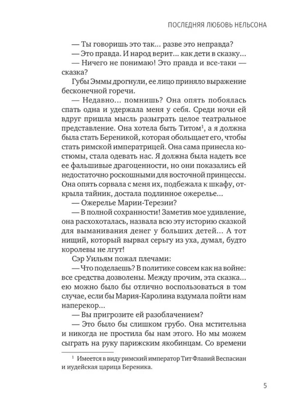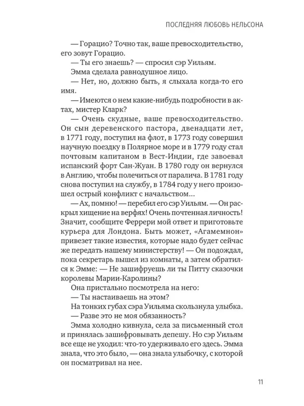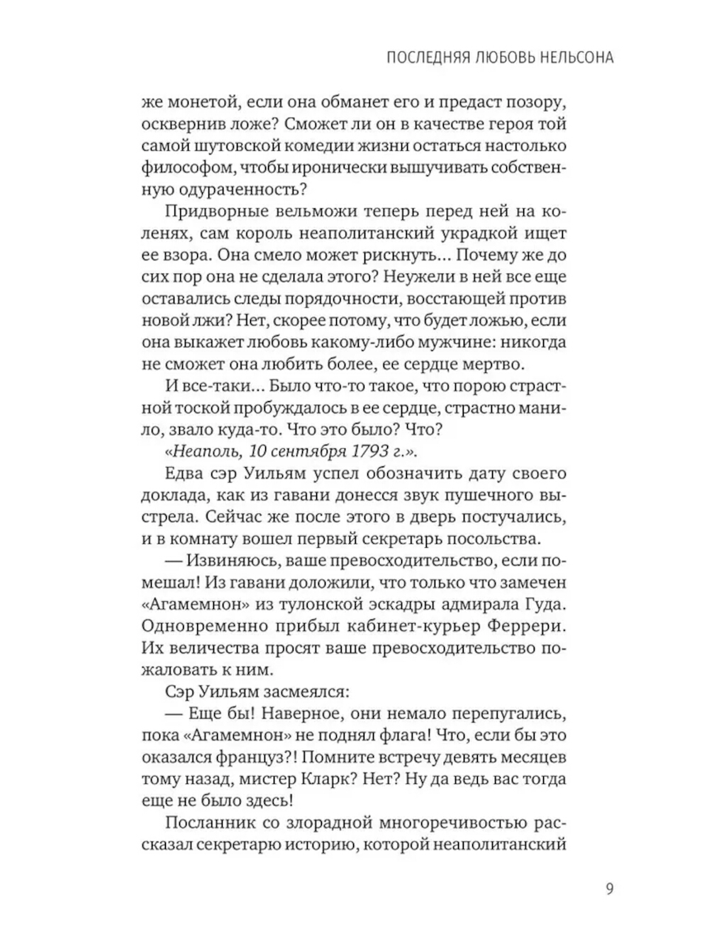 1793 год. Леди Эмма помогает своему мужу, сэру Уильяму Гамильтону, заботиться об интересах Англии при дворе неаполитанского короля. Сэр Уильям - посол, а его жена, хоть и не занимает никакой официальной должности, участвует во всех политических интригах наравне с мужем. Положение обязывает ее поддерживать фальшивую дружбу с неаполитанской королевой Марией-Каролиной, лгать и притворяться каждый день. Но многое меняется, когда в Неаполь прибывает английский корабль «Агамемнон» под командованием капитана Горацио Нельсона. Эмма проникается чувством к открытому и честному моряку. Она больше не хочет лгать, но изменить привычную жизнь мешают обстоятельства и темное прошлое Эммы, которое постоянно напоминает о себе.| Издательство | Вече |