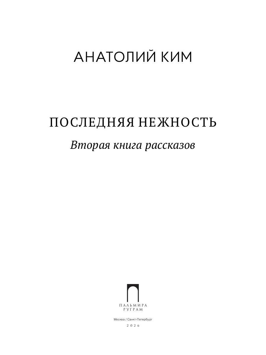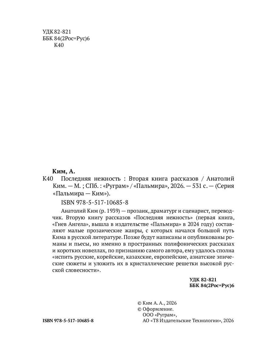 Анатолий Ким (р. 1939) - прозаик, драматург и сценарист, переводчик. Вторую книгу рассказов «Последняя нежность» (первая книга, «Гнев Ангела», вышла в издательстве «Пальмира» в 2024 году) составляют малые прозаические жанры, с которых начался большой путь Кима в русской литературе. Позже будут написаны и опубликованы романы и пьесы, но именно в пространных полифонических рассказах и коротких новеллах, по признанию самого автора, ему удалось сполна «испить русские, корейские, казахские, европейские, азиатские эпические сюжеты и уложить их в кристаллические решетки высокой русской словесности».| Издательство | Т8 RUGRAM |